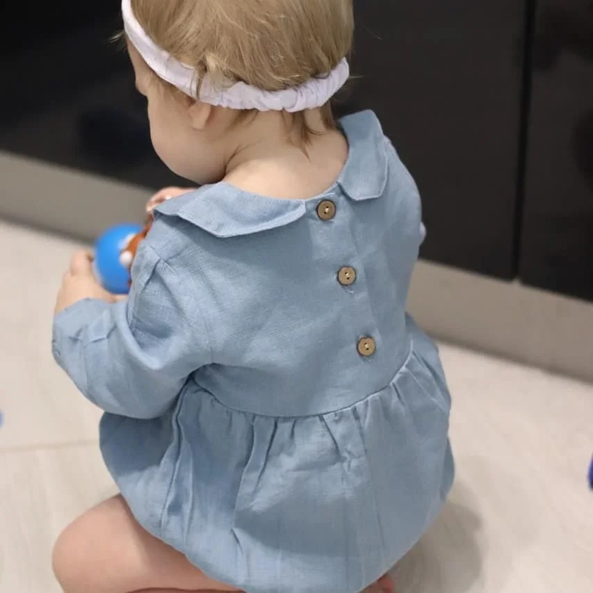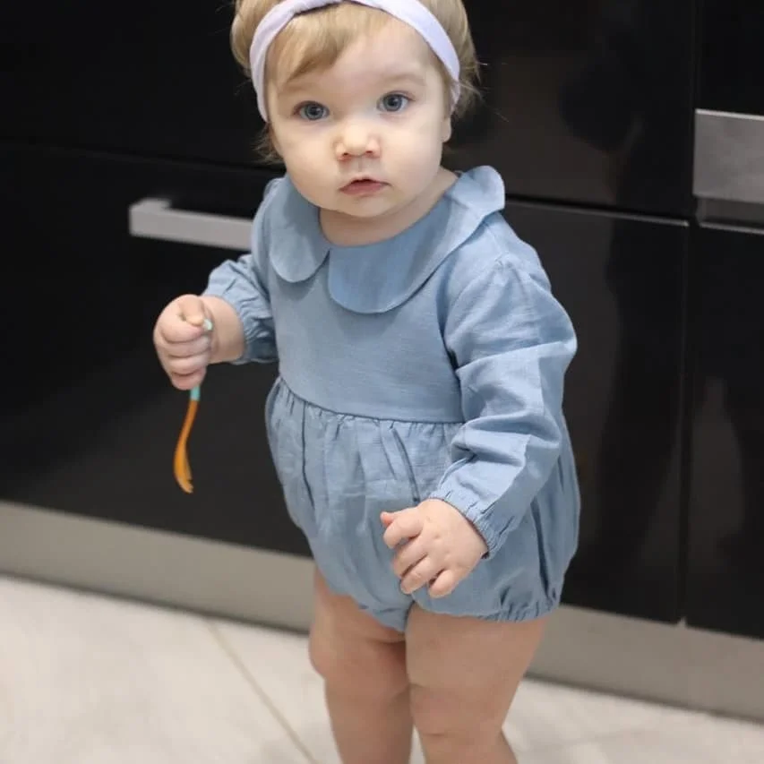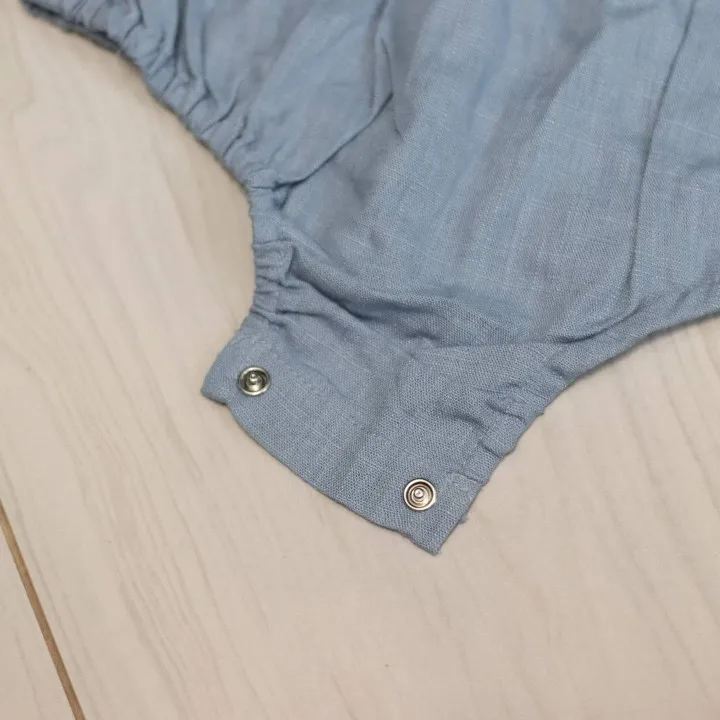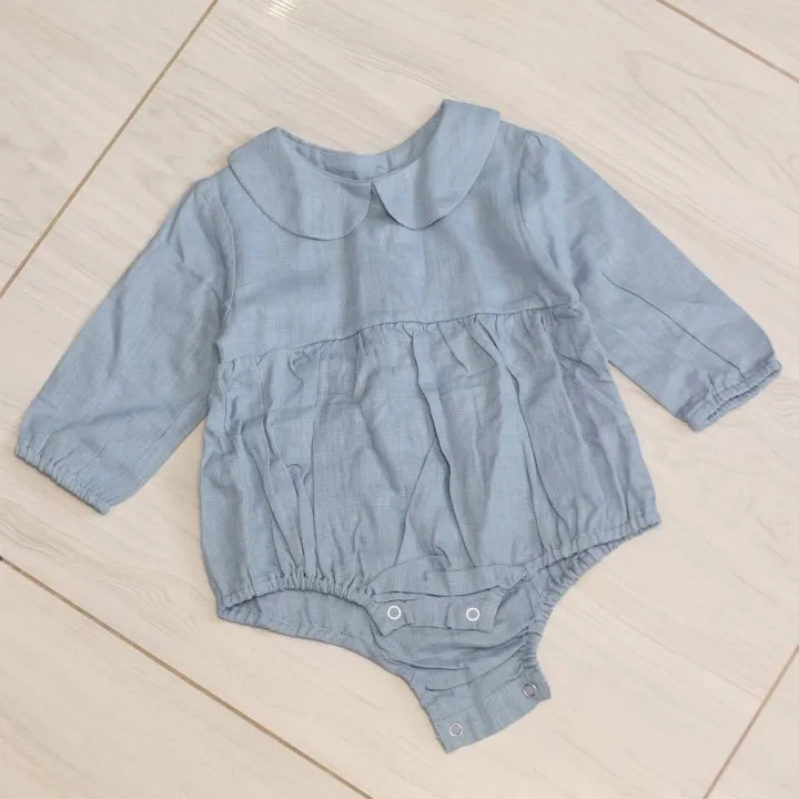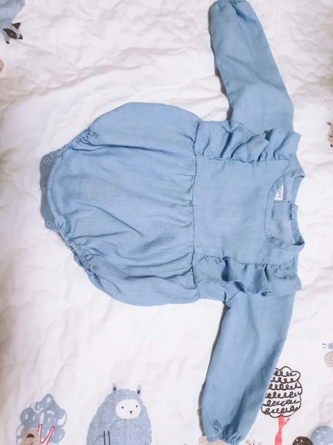 Детский бодик. Симпатичный боди с длинным рукавом. Ткань окрашена под джинс, состав 70% хлопок, 30% лён. Застегивается сзади на 3 пуговки, также есть клепки между ножек. На рукавах мягкие резиночки. На рост ребёнка 80 см подошёл размер 18-24 месяца. Но на подгуз сидит впритык. У продавца товар представлен в 11 цветовых решениях и 6 размерах. Покупкой довольна, могу рекомендовать.