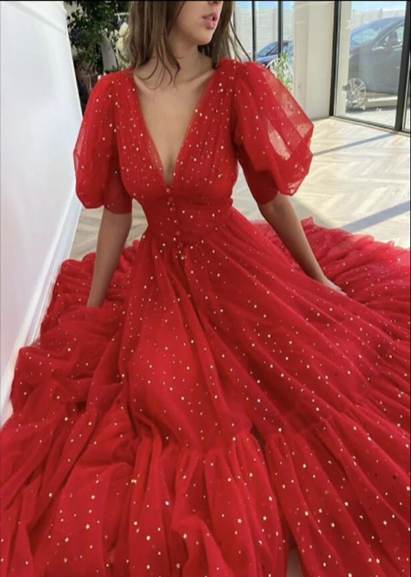 Платье для выпускного вечера Sevintage, пышное Тюлевое платье с блестящими звездами, с V-образным вырезом, короткими рукавами, длиной до колена, на пуговицах, для свадьбы