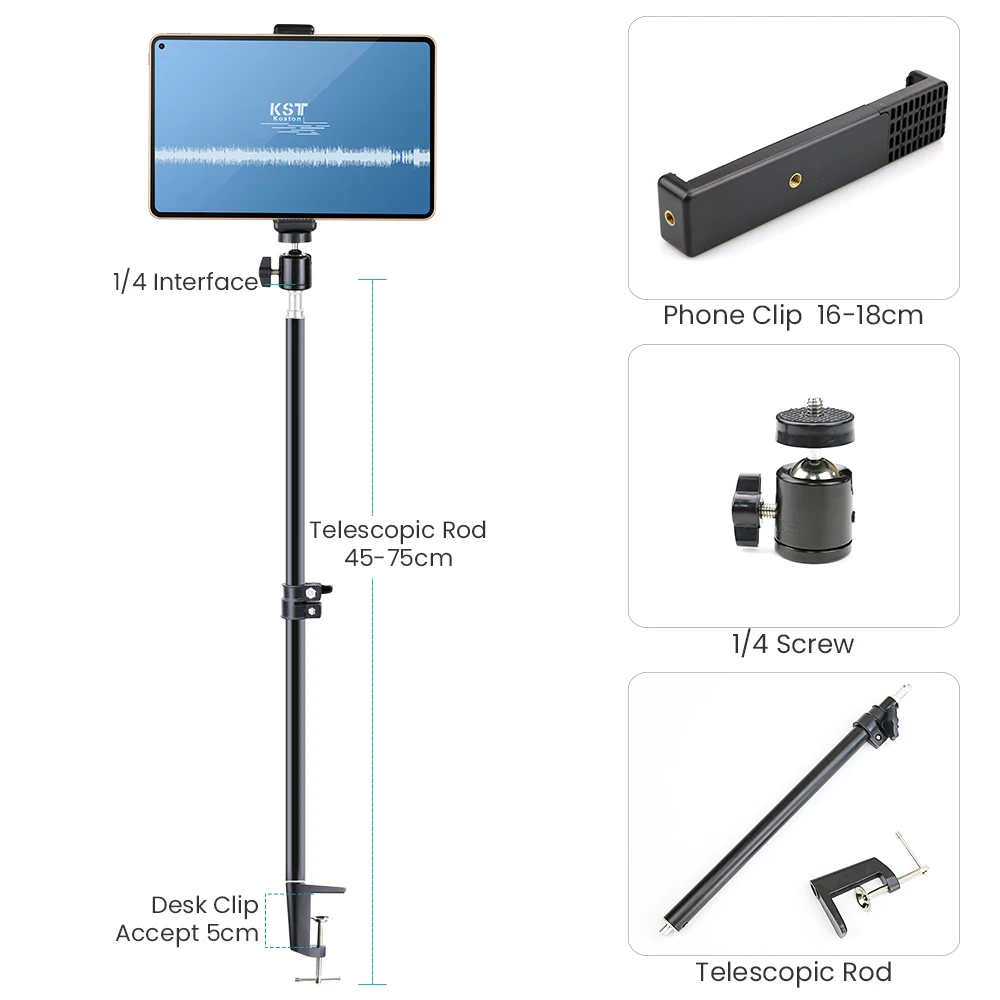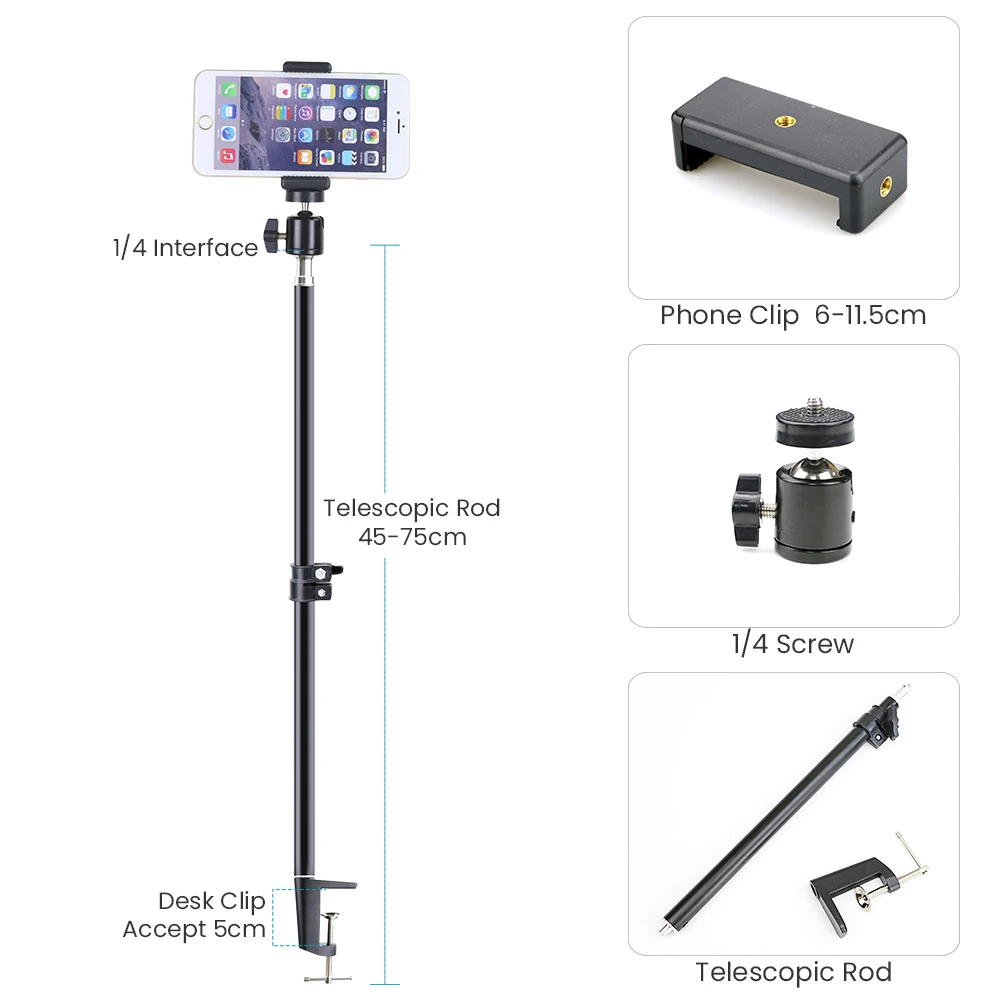 1. Регулируемая подставка:Высота стойки может регулироваться от 38 см до 66 см/от 15 до 26 дюймов; Это удобная подставка для осветительного оборудования;2. Стандартный 1/4 дюйма Винт:Разработан со стандартным 1/4 "винтом, он поддерживает большинство фотографий светильник оборудования, таких как, кольцевой светильник, светодиодный видео светильник, держатель смартфона, Dslr камеры и т. Д.3. Стабильный и прочный:Изготовлен из алюминиевого сплава, который обеспечивает длительное использование без ржавчины, что делает его сильным для тяжелой работы и предотвращения деформации4. Регулируемый зажим для крепления стола:Зажим регулируется для установки различных столов с помощью регулировки ручки и винта. Зажим может поддерживать толщину стола 5 см5. Широкое применение:Этот настольный светильник с регулируемой высотой отлично подходит для поддержки кольцевого светильник, камеры, смартфона, видео светильник и т. Д., который может быть идеально использован в макияже, интервью, светильник ing, потоковой передачи, видеосъемка