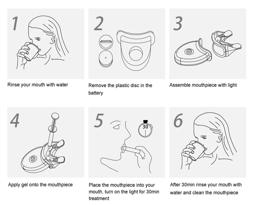 1. Краску в рот с водой 2. Снимите пластиковый диск в батарее 3. Собрать мундштук с светильник 4. Нанесите гель на мундштук 5. Поместите мундштук в рот, включите светильник в течение 30 минут 6. По истечении 30 мин краску изо рта с водой и очистите mouthpiec