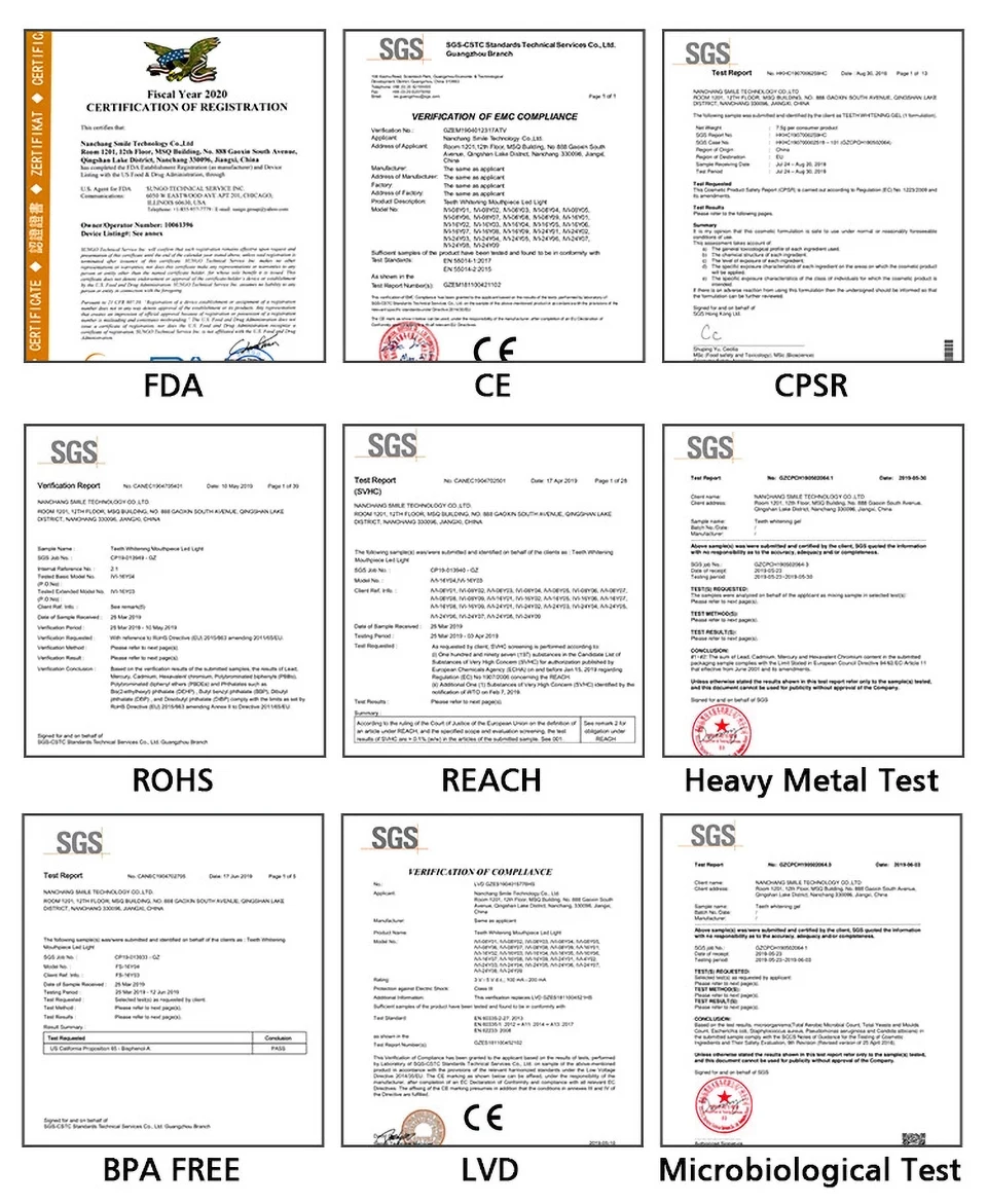 Nanchang Smile Technology Co.,Ltd является профессиональным производителем продуктов для отбеливания зубов, таких как отбеливание зубов, светодиодный лоток для рта, шприц для зубов, отбеливающий гель, отбеливающий гель для зубов, отбеливающий гель для зубов, отбеливание зубов, набор для отбеливания зубов, косметическая маска и т. д. В области отбеливания зубов более 10 лет, У нас есть собственная лаборатория без пыли и профессиональные исследователи, которые предлагают вам технические консультации по стоматологическим материалам. У нас есть довольно строгая система управления производством, охватывающая контроль качества сырья, контроль формул производства, тест на наполнение и тест качества готовой продукции, чтобы предоставить вам высококачественную продукцию.