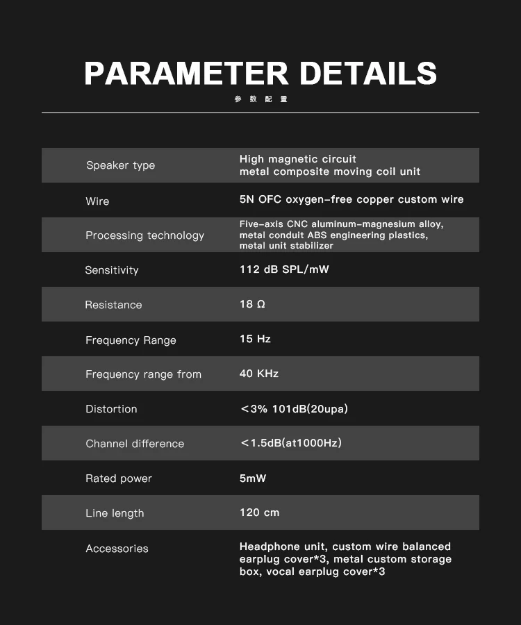 Тип динамика: металлический композитный подвижный катушечный блок с высокой магнитной цепью Кабель: бескислородный медный провод 5N OFC, Пятиосевой алюминиевый Магниевый сплав с ЧПУ, металлический провод Технология обработки: инженерный пластик АБС, стабилизатор металлического блока Чувствительность: 112 дБ SPL/мВт Импеданс: 18 Q Частотный диапазон: 15 ГЦ-40 кГц Искажение: < 3% дБ (20 мкпа) Разница каналов: <1,5 дБ (AT1000 Гц) Номинальная мощность: 5 мВт Длина лески: 120 см Аксессуары: наушники, индивидуальный проводной сбалансированный чехол для наушников × 3, металлический ящик для хранения под заказ, чехол для голосовых ушных вкладышей X3