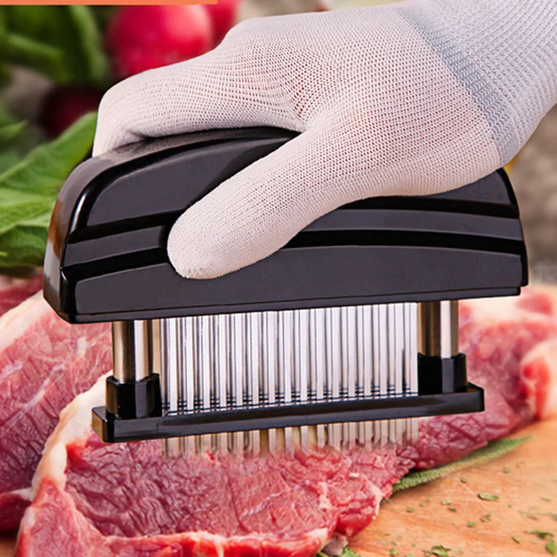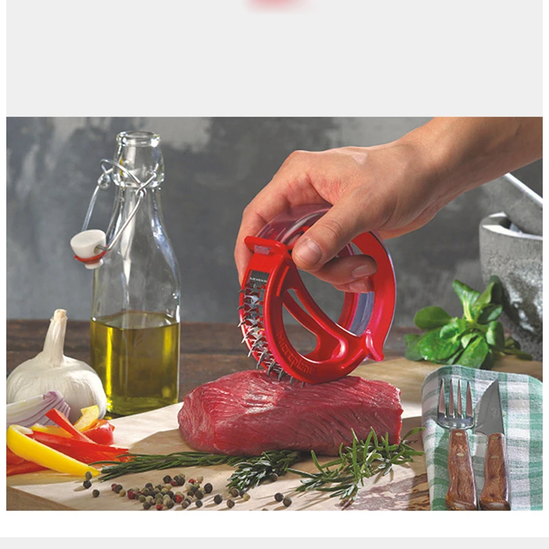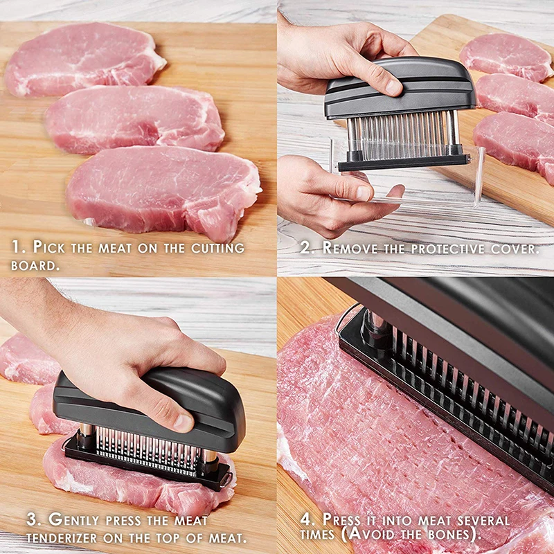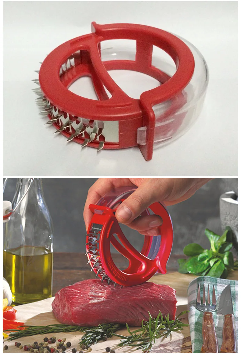 Безопасный и простой в использовании-изготовлен по чрезвычайно высоким стандартам, с пищевым АБС-пластиком и 48 лезвиями из нержавеющей стали, это прочное сконструированное устройство оснащено пружинным блоком, который умело убирает лезвия для обеспечения безопасности, проколов их аккуратно и легко через мясо. Эргономичная форма удобно лежит в руке; Просто надавите на устройство для использования, активируя три ряда сверхпрочных сверхострых лезвий.