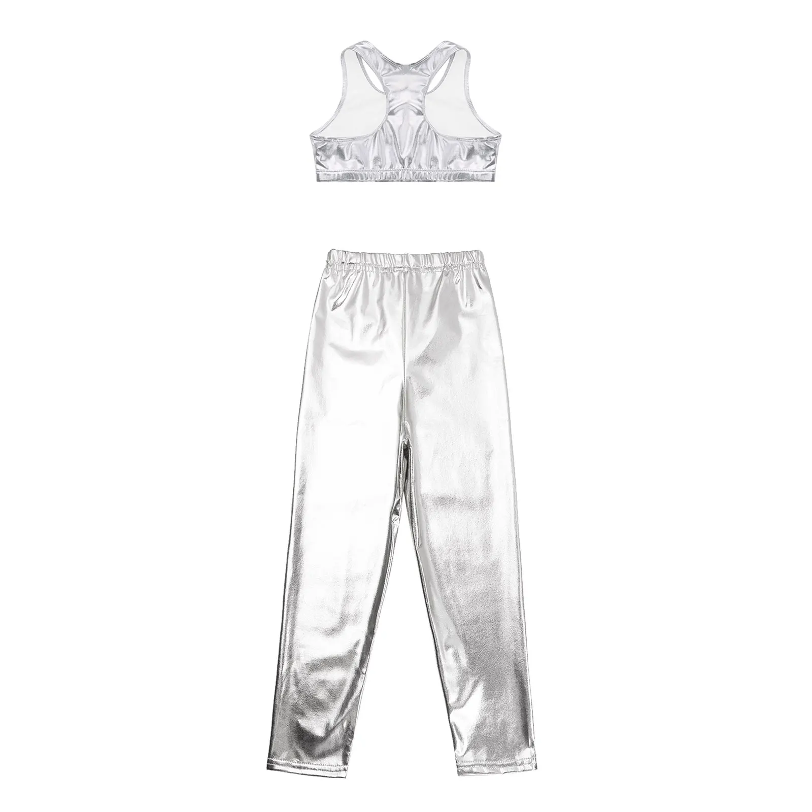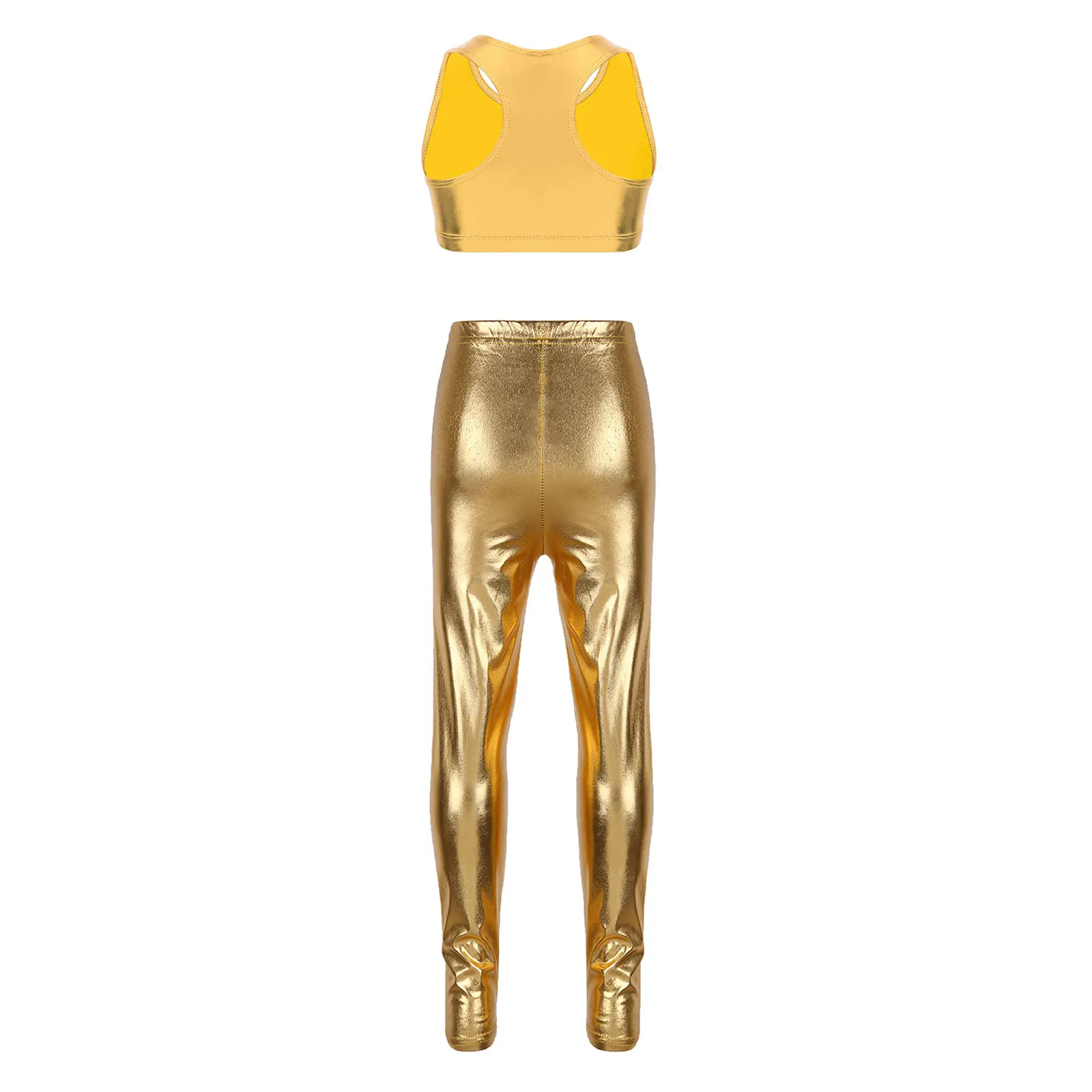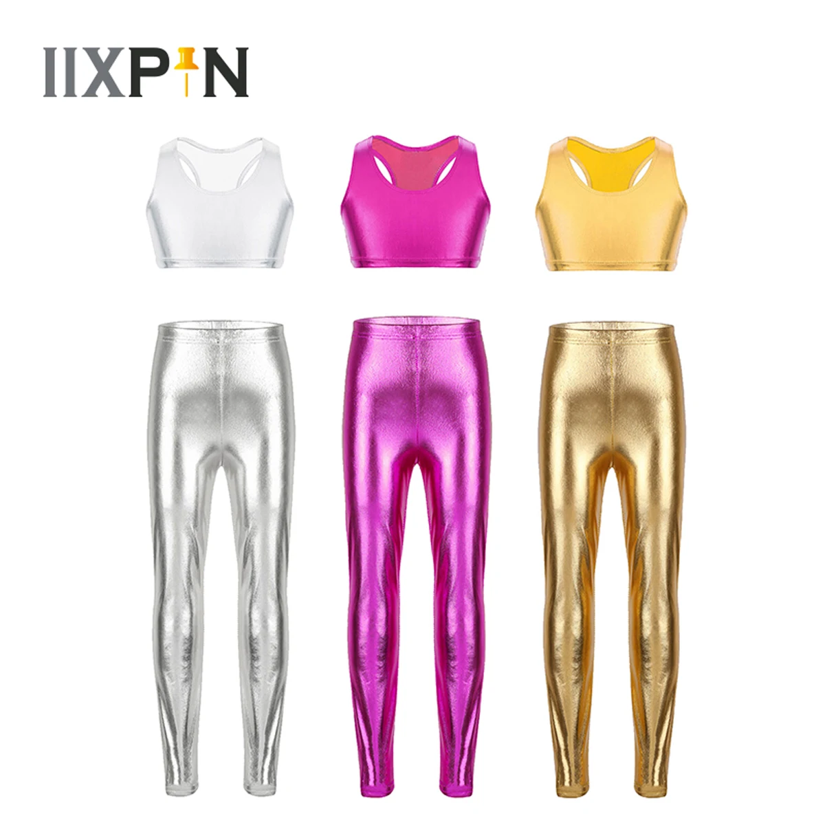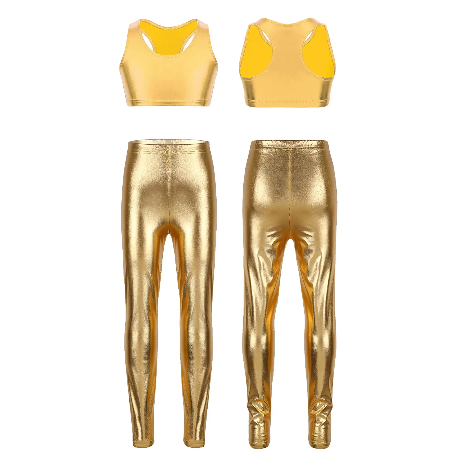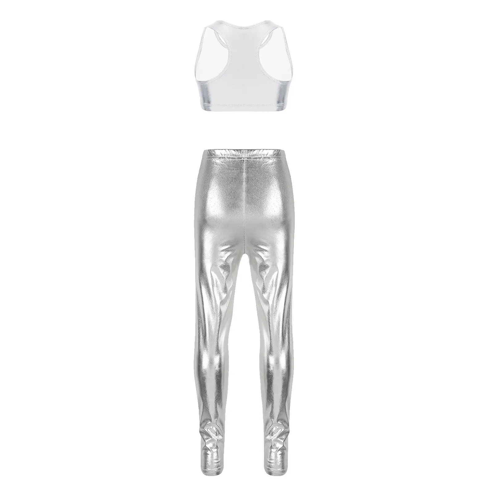 # M-2XL; Блестящий металлический укороченный топ без рукавов для девочек; Обтягивающие штаны; Леггинсы для балета; Танцевальная одежда для сцены