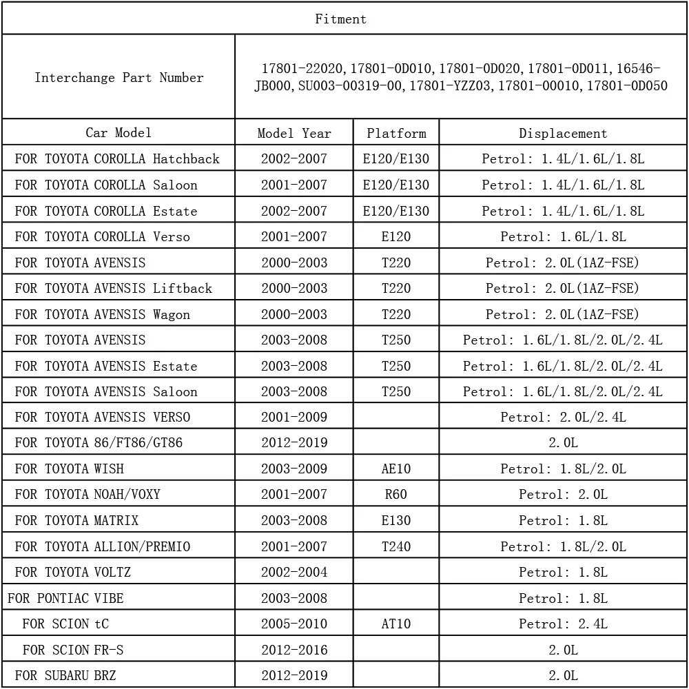 Приспособление:Для Toyota Corolla Hatchback E120 E130 2002 2003 2004 2005 2006 2007 1.4L 1.6L 1.8LДля Toyota Corolla Saloon E120 E130 2001 2002 2003 2004 2005 2006 2007 1.4L 1.6L 1.8LДля Toyota Corolla Estate E120 E130 2002 2003 2004 2005 2006 2007 1.4L 1.6L 1.8L