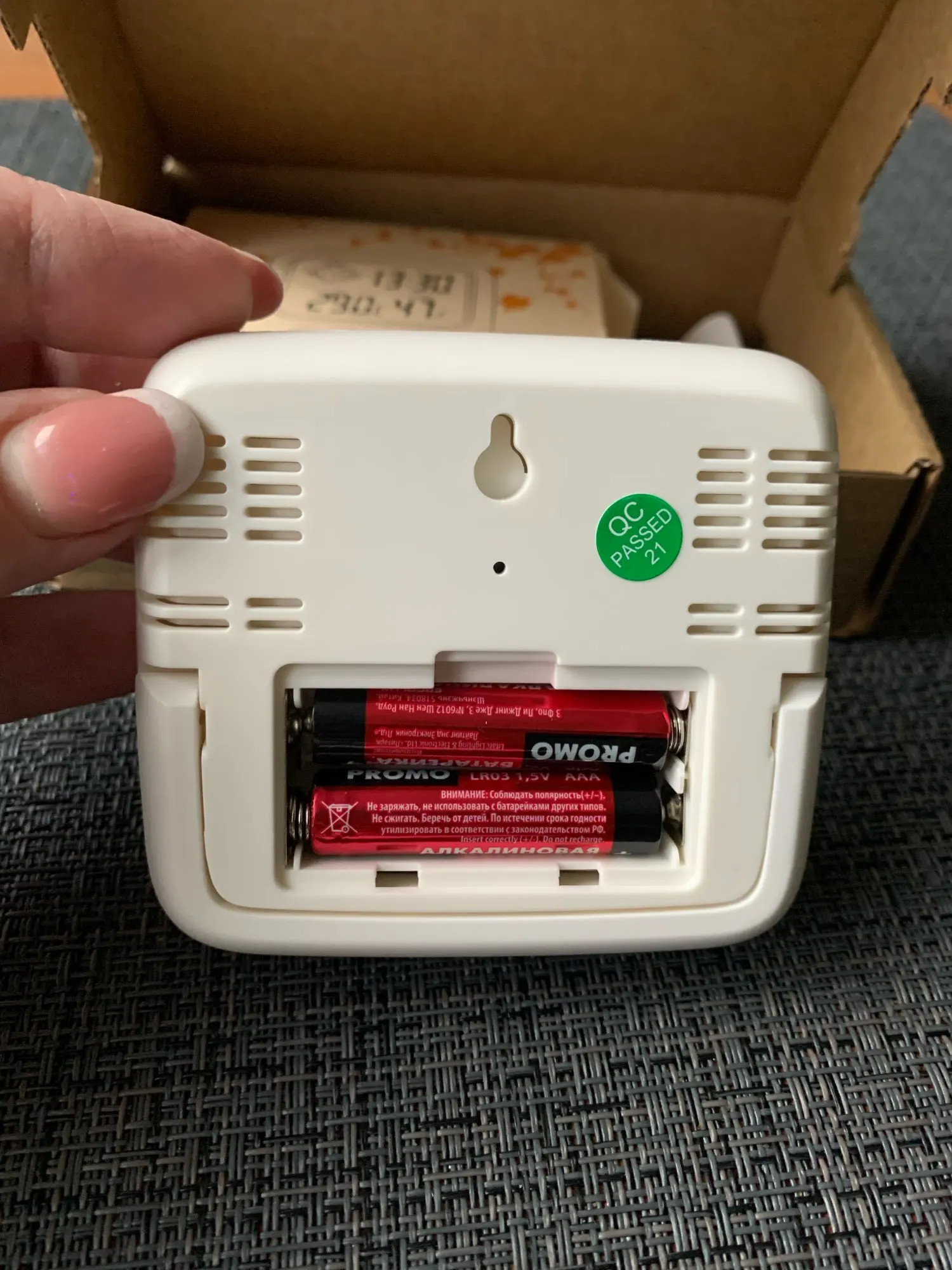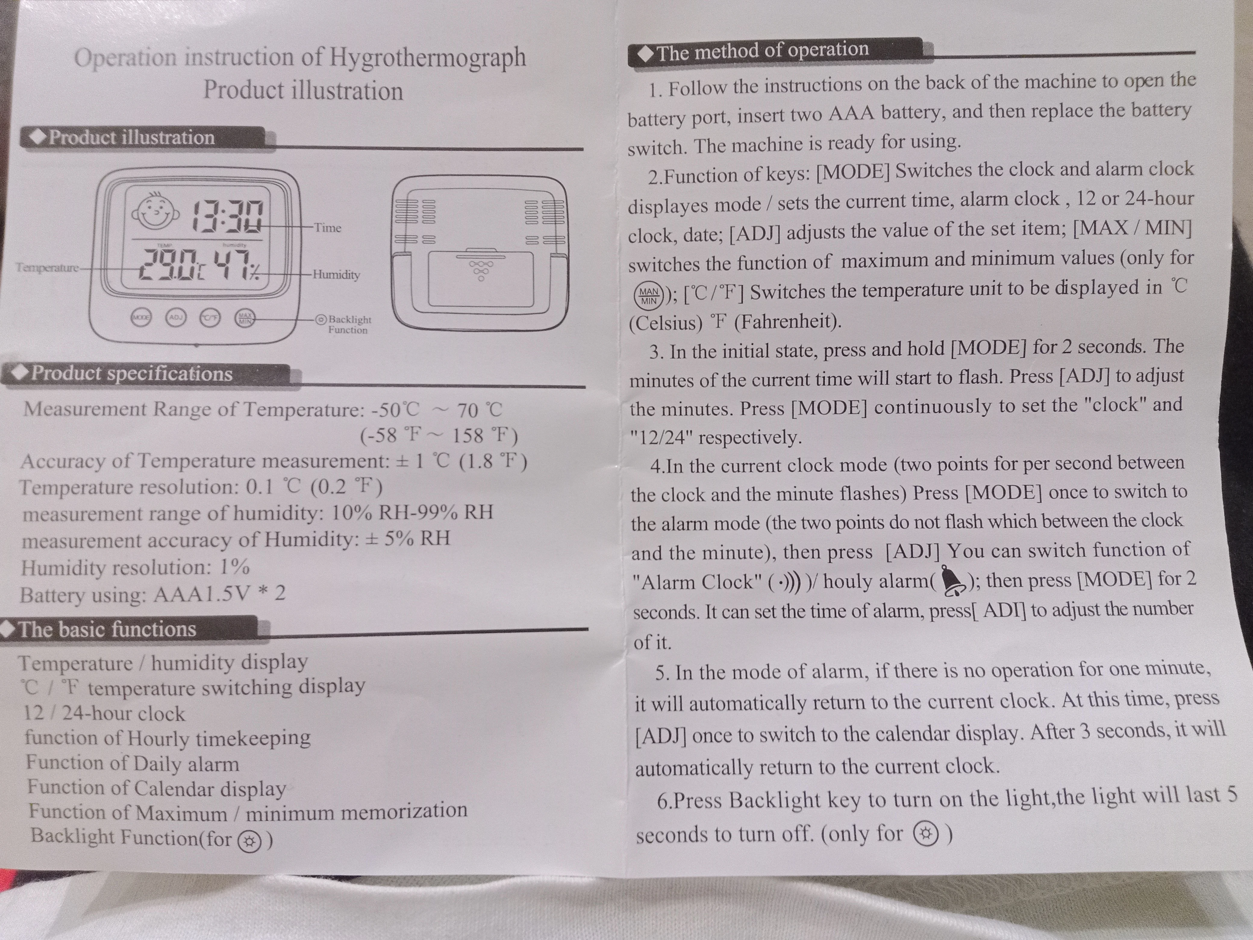 Температуру показывает хорошо, совпадает с другим термометром, влажность расходятся, но возможно это проблема более дешевого старого гигрометра, а не этого. Дошло до НСК за 3 недели, работает от 2-х батареек ААА. Экран четкий, звук отключила. Инструкция на английском и китайском, но для настройки часов мне и не понадобилась. Покупкой довольна.