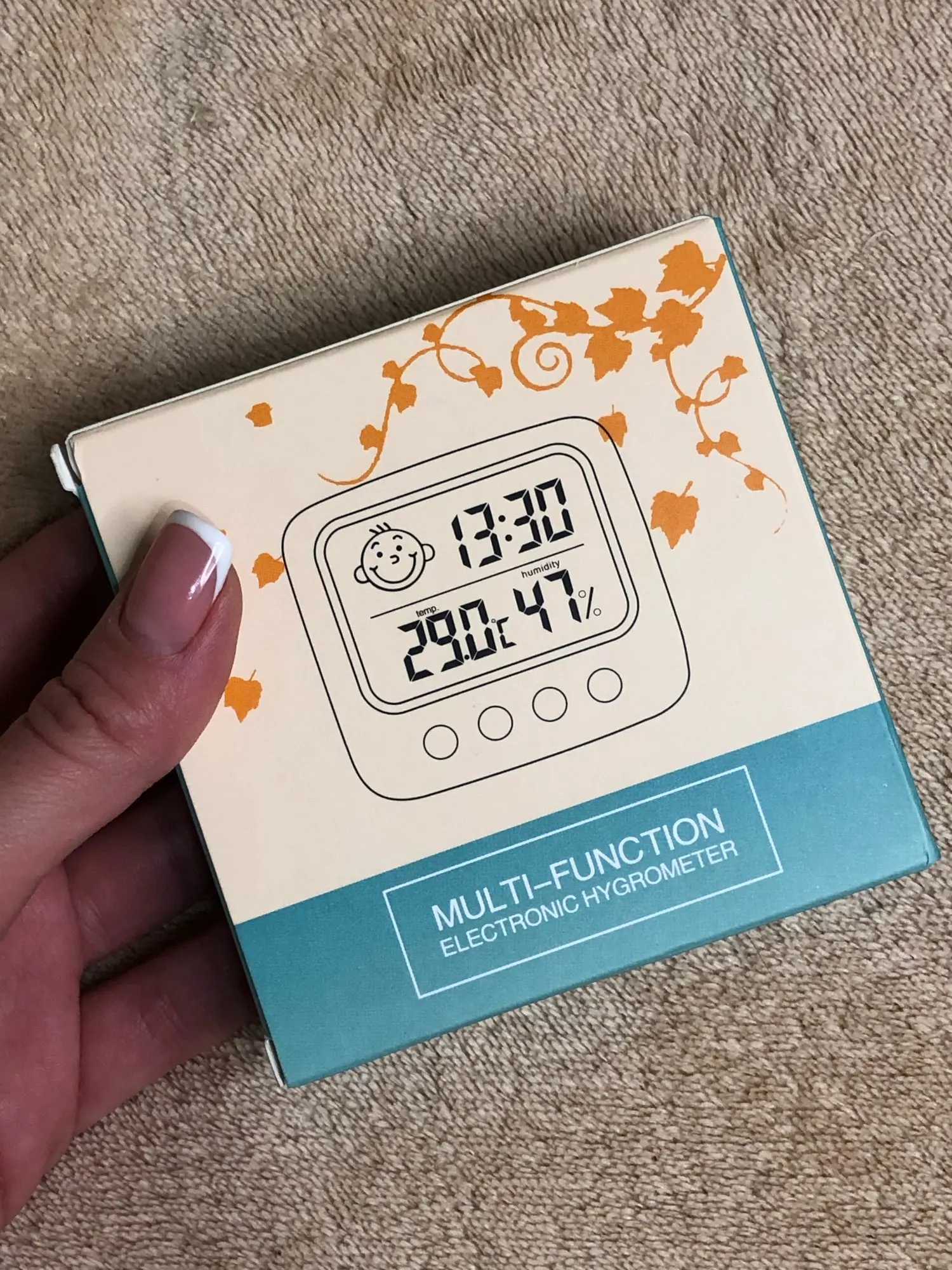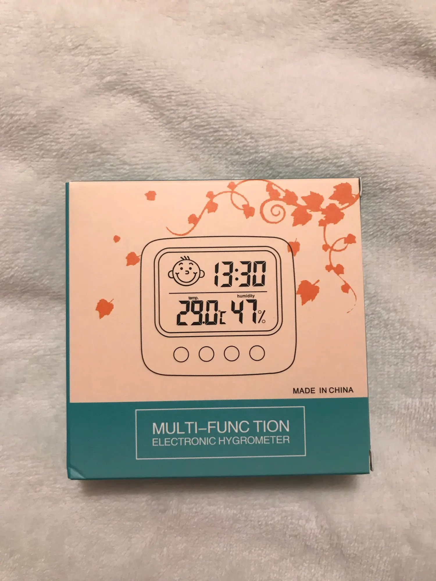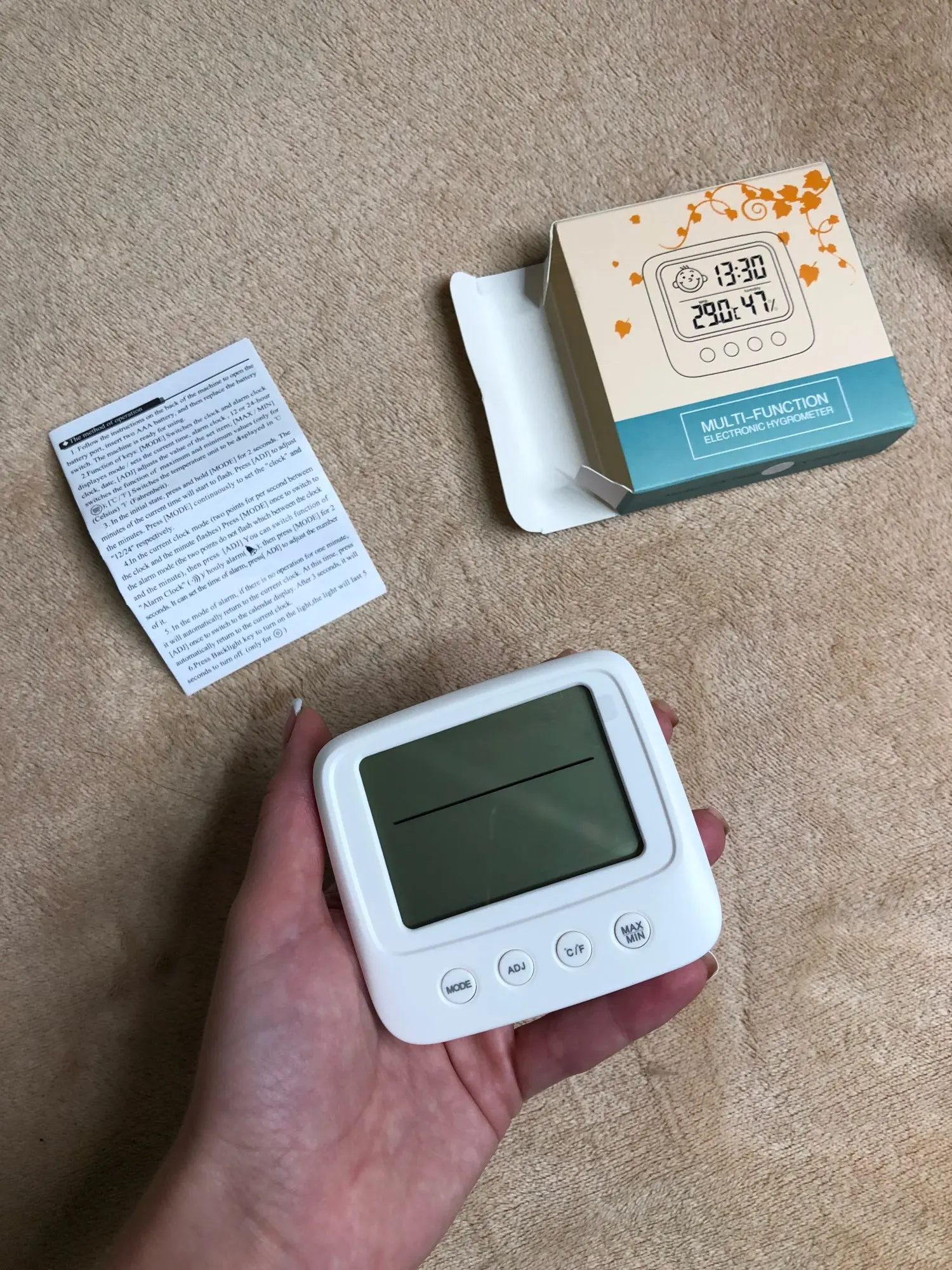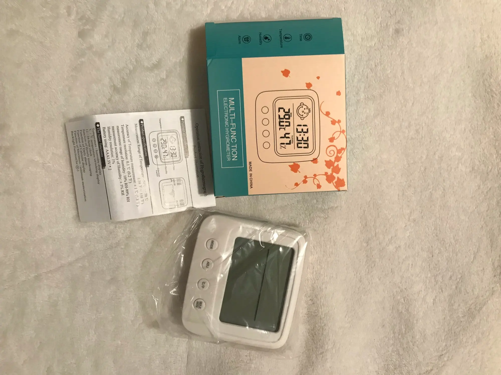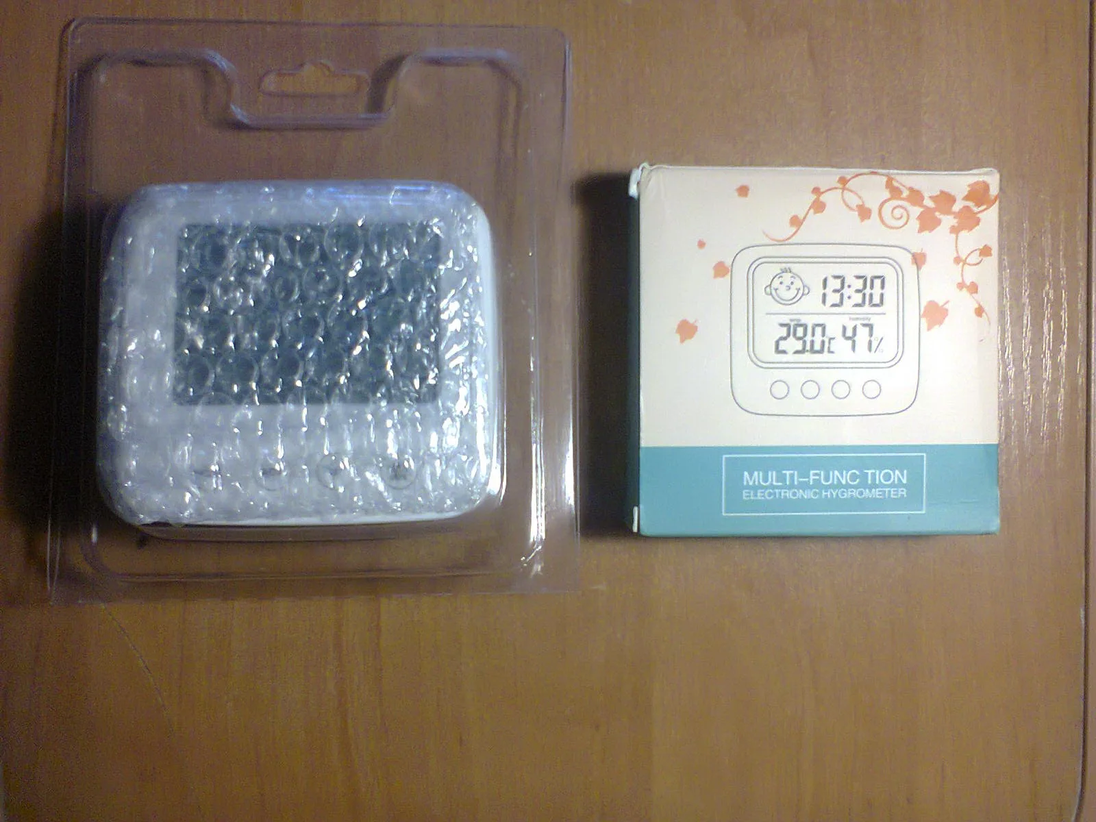 Один из лучших товаров, приобретенных мною за последнее время. Заказала 11.11, пришло 14.12. Упаковано в индивидуальную коробку, это огромный плюс. Давно искала себе устройство компактного размера, которое будет вмещать в себе время, температуру и влажность. Это очень удобное и легкое устройство, благодаря подставке сзади, его можно поставить на любую ровную поверхность в доме. Сделано из пластика, но выглядит отлично. Я взяла вариант с подсветкой: ночью эта подсветка отлично работает, видно все супер. Очень компактный, много места не занимает. Температуру измеряет +/- правильно, так же и влажность. Очень нужная вещь. Единственный весомый минус: к сожалению, в инструкции недостаточно понятно описано как настроить время (инструкция на английском и китайском языке). Мне пришлось долго разбираться, но в конечном счете, мне все таки удалось настроить устройство. За такие деньги определенно стоит брать.
