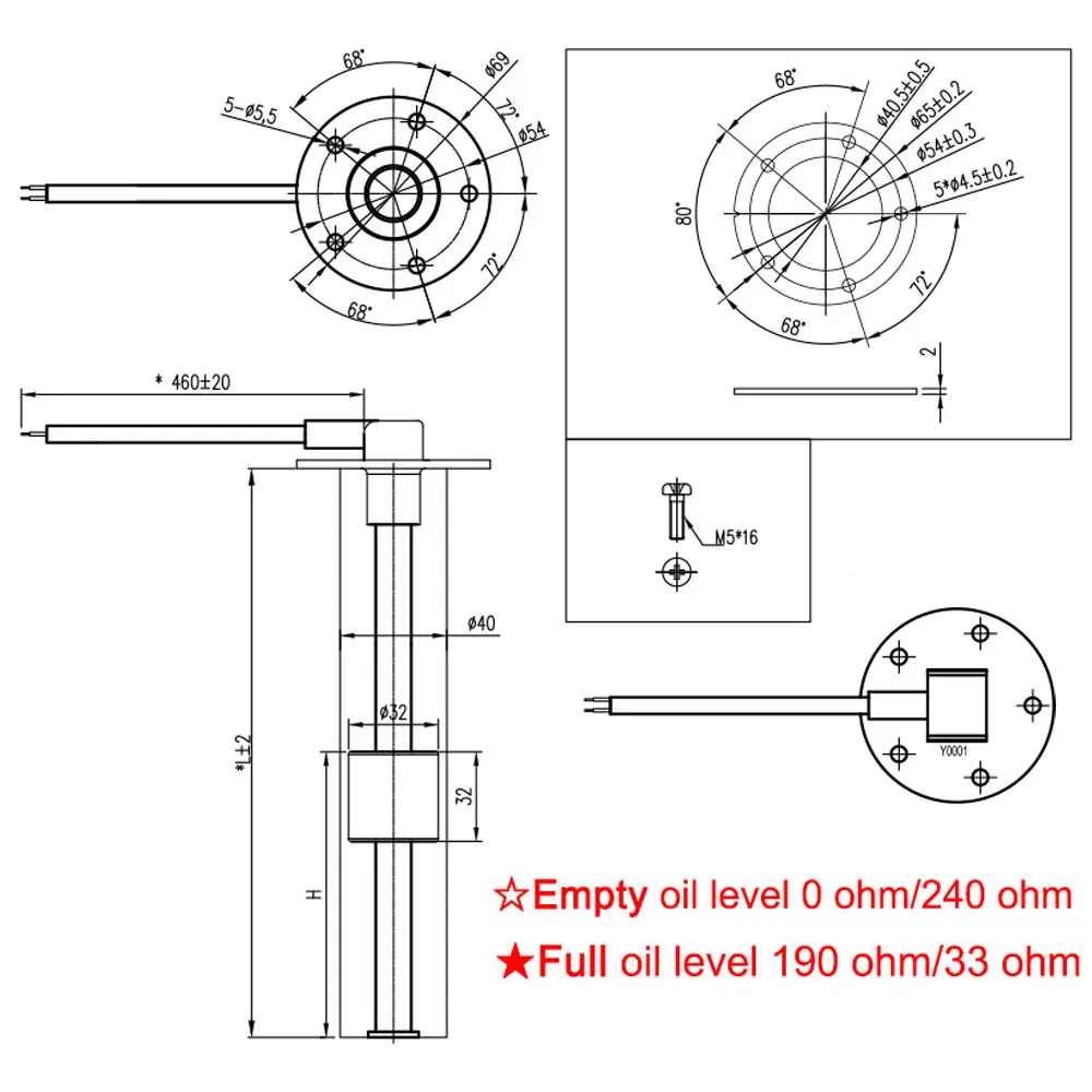 -Защита АНК: IP67-Разрешение: 21 мм-Сборка: стандарт SAE, 5 отверстий-Номинальный ток для переключателя сигнализации: 500 мА-Рабочая температура: от-40 до 85 градусов Цельсия-Подходит для датчика уровня сточных вод/топлива и уровня воды-Длина датчика: 100 мм ~ 1500 мм-Крепление: 5 штук винтов M5 и прокладка толщиной 2 мм-Выходной сигнал: 0 ~ 190 Ом (стандартный европейский),