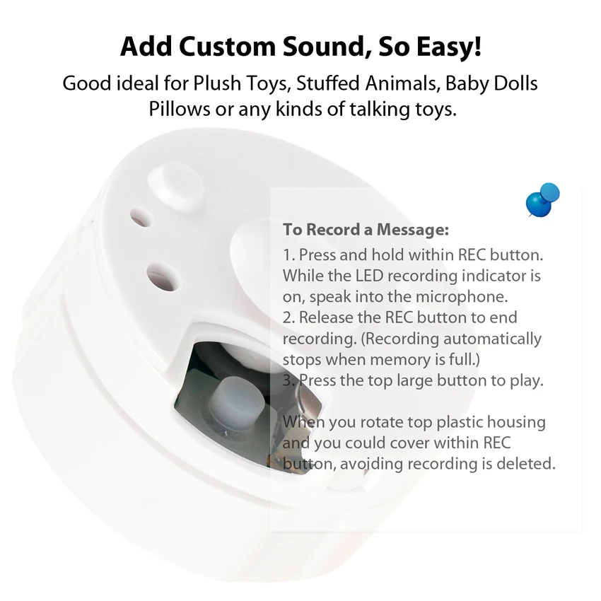 Для записи всего 3 шага.1. Нажмите и удерживайте кнопку REC. Пока светодиодный индикатор записи включен, говорите в микрофон.2. Отпустите кнопку REC, чтобы завершить запись. (Запись автоматически останавливается, когда память заполнена.)3. Нажмите большую верхнюю кнопку для воспроизведения.Когда вы поворачиваете верхний пластиковый корпус, и вы можете покрыть кнопку REC, избегая записи удаляется.