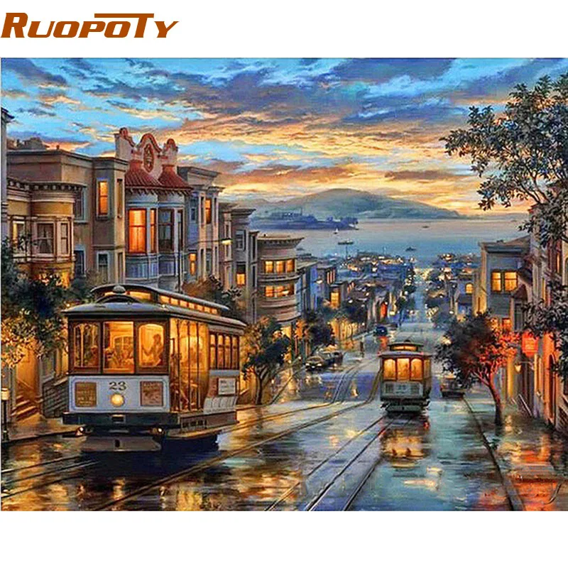 RUOPOTY ночной город автобус Diy картина маслом по номерам Пейзаж Современная Картина на холсте уникальный подарок стены искусства