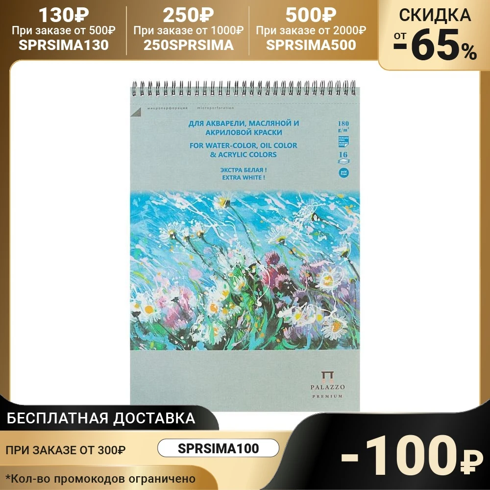 Альбом для акварели, масляной и акриловой краски В4, 16 листов на гребне Русское поле, экстра белый блок, 180 гм