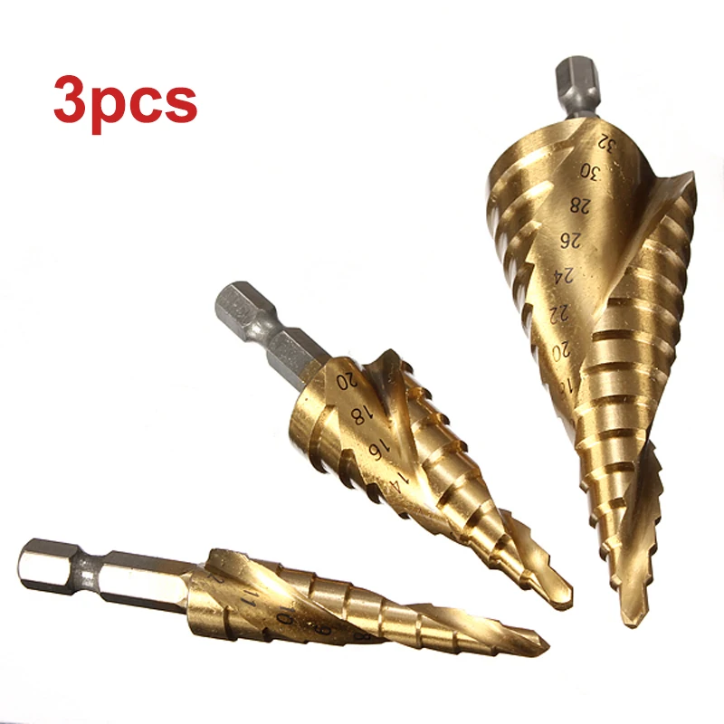3 шт., ступенчатые конусные Сверла HSS 4-12 мм 4-20 мм 4-32 мм с титановым покрытием, спиральные сверла 1/4 дюйма, резец отверстий, режущий инструмент