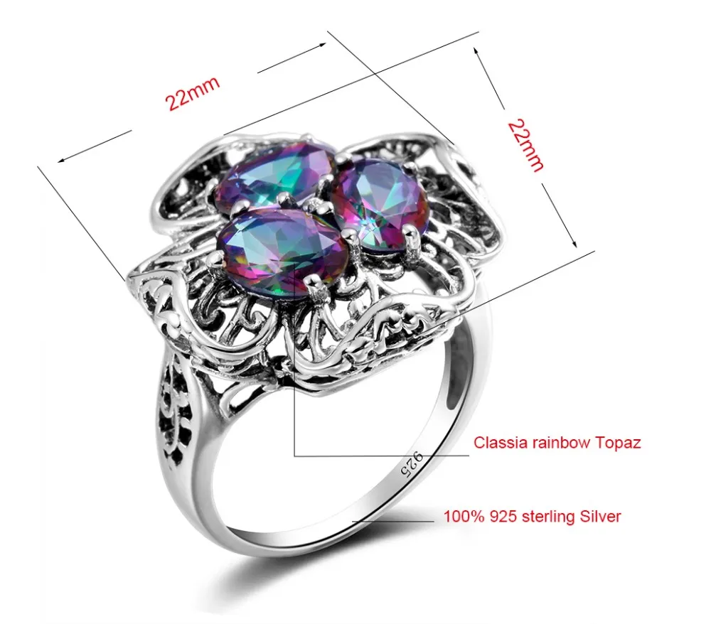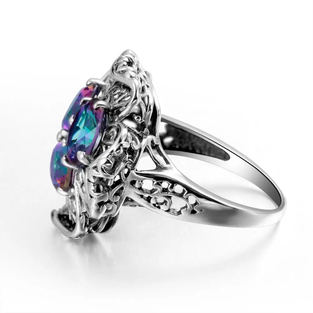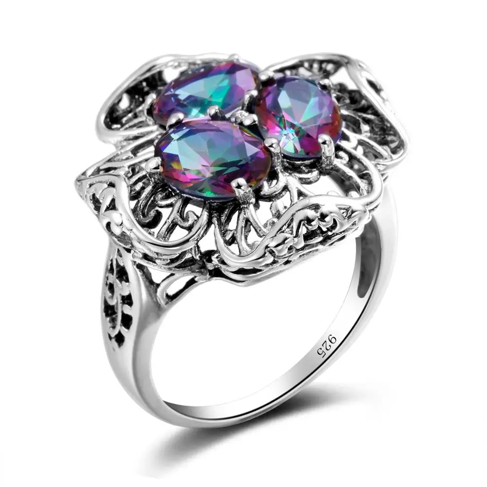 Реальные 925 Серебряное кольцо драгоценный камень кольцо с мистик топазом кольца с цветочным рисунком в винтажном стиле; Дизайнерские туфли ручной работы, уникальные вечерние женские украшения на Рождество
