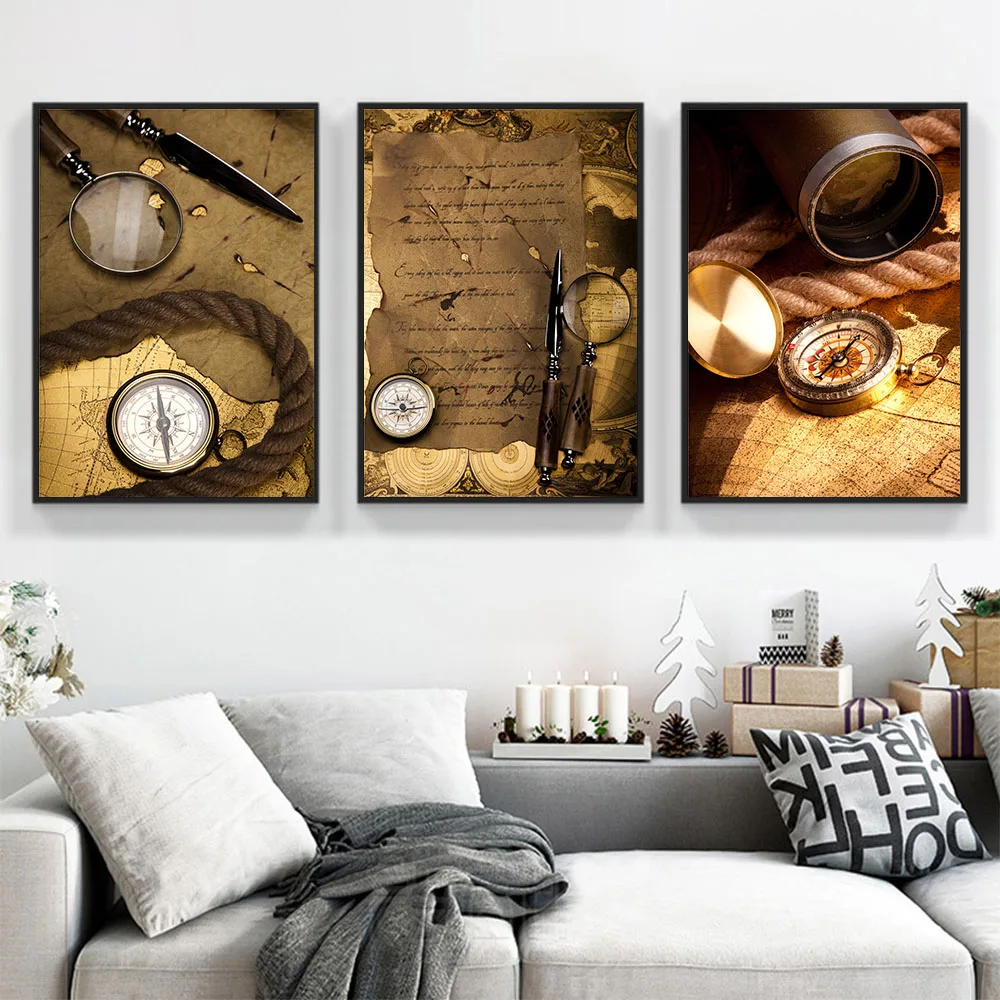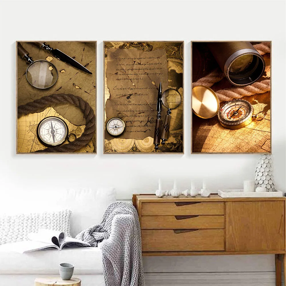 Винтаж Морской Карта увеличительное Стекло Yelescope парусный спорт Compass Кракен море океан Приморский постер холст искусство живописи, печать