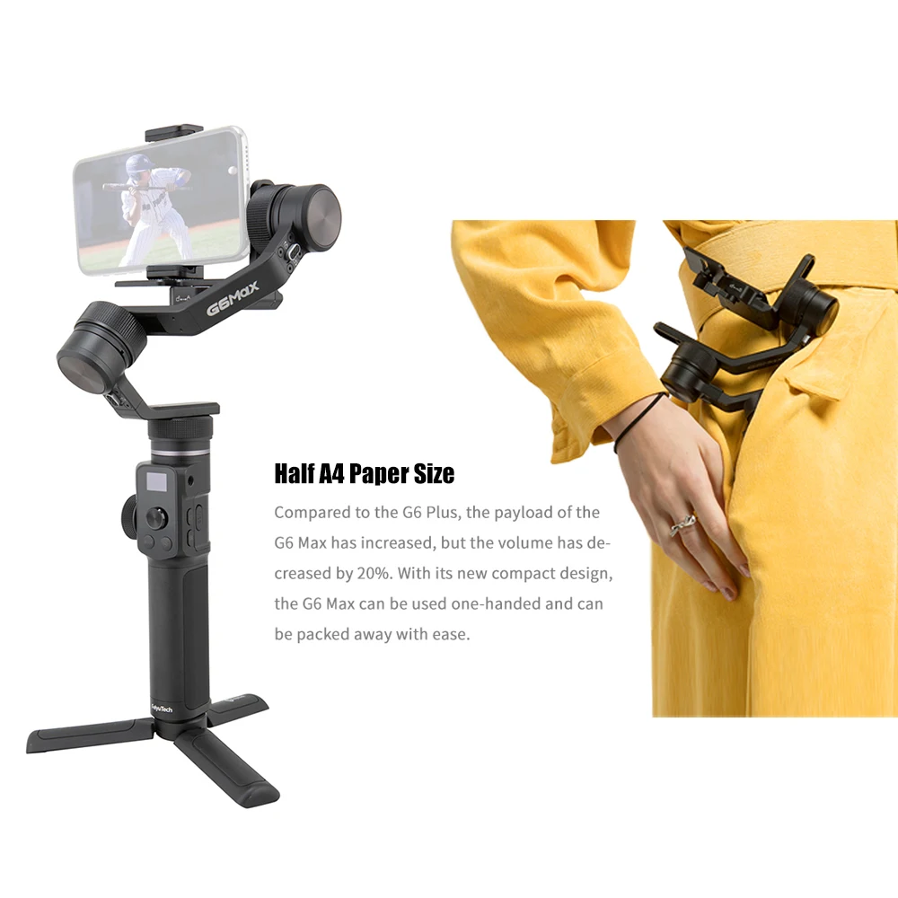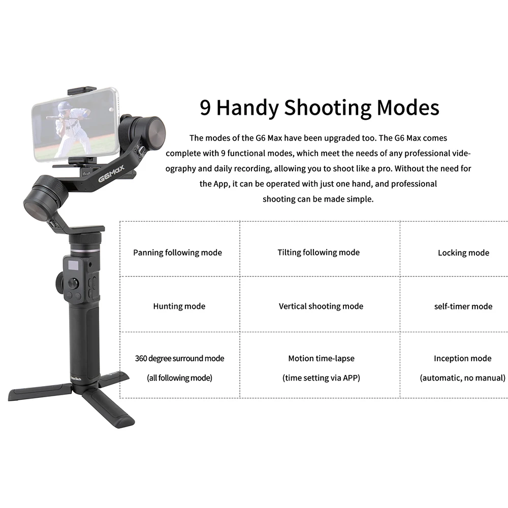 Совместимость с BMPCC 1-го поколения, Fujifilm XT20, Leica D-lux и т. Д. Совместим с GoPro Hero 5/6/7, RX0, SJ6 Legend, FDR-X3000R, HDR-AS50R и т. д. Совместимый Смартфон: 54 мм ~ 88 мм ширина смартфонов Макс. Нагрузка Ёмкость: 1,2 кг/2,65 фунтов лёгкий нейлоновый трос Тип батареи: Встроенный 7,4 V 2200mAh перезаряжаемая литиевая батарея Время работы батареи: прибл. 9 часов Время зарядки: прибл. 3 часа (5 В/2 а) Угол наклона: 280 ° Диапазон угла прокатки: 330 ° Угол панорамирования: 360 ° Товар Вес: 665g/23,5 oz Размер посылка: 29*20*8 см/11,4*7,9*3,1 дюймов Вес посылка: 1050 г/37 унций Посылка: 1 * G6 Max Gimbal 1 * EPP сумка 1 * спуск затвора для panasonic (тип C до DC2.5) 1 * кабель затвора для Sony (Type C to Multi) 1 * USB-C кабель 1 * Адаптер для GoPro 1 * длинный винт 1 * Штатив 1 * БЫСТРОРАЗЪЕМНАЯ пластина 1 * Адаптер для смартфона 1 * Руководство пользователя (английский, китайский, немецкий, французский, итальянский, португальский, русский)