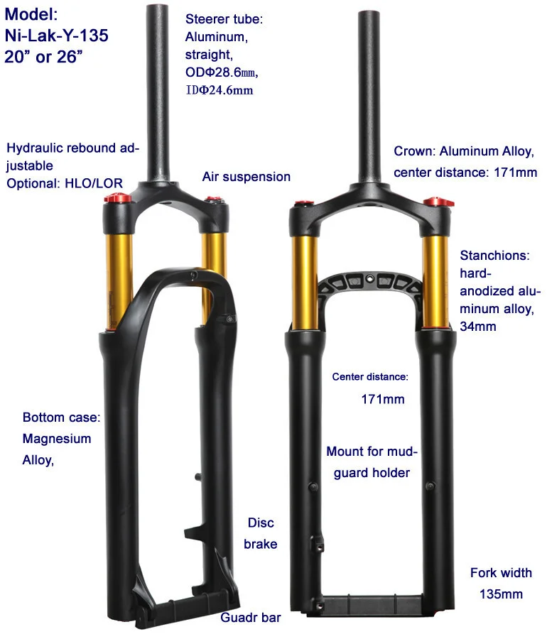 Вилка для фэтбайка, подвеска 20*4,0 дюйма, колеса 26 дюймов, из алюминиевого сплава, пневматическая Велосипедная вилка для фэтбайка 4,0 дюйма, аксессуары для электровелосипеда