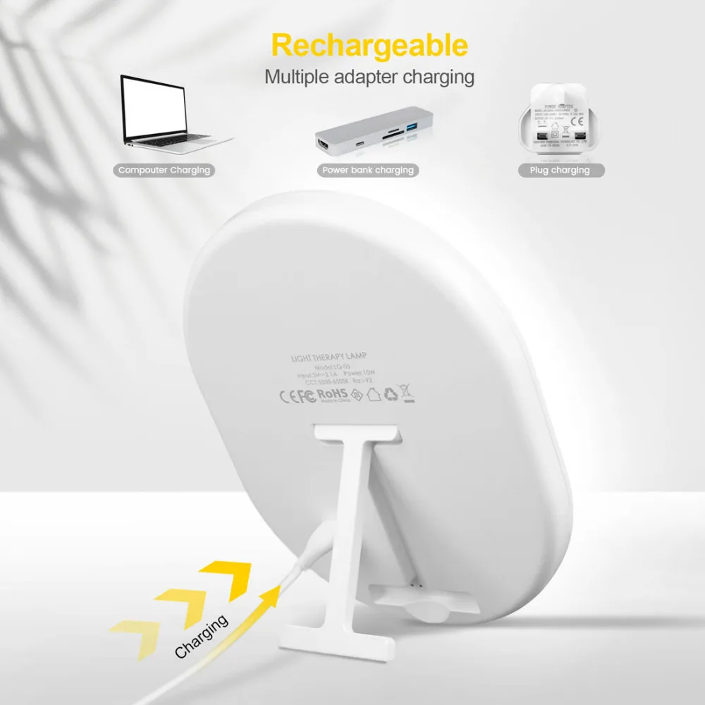 【 3 уровня BRIGHTNESS】SAD лампа с тремя регулируемыми уровнями яркости (низкий светильник 40%, средний-светильник 60%, сильный светильник 100% ), вы можете изменить, что вам нравится, чтобы вы чувствовали себя наиболее комфортно.【 4 комплекса предпусковых операций TIMER】The грустно светильник имеет 4 таймера со встроенным таймером (15/30/45/60 минут) мы рекомендуем начинать с 15 минут, а затем постепенно увеличивать до 15 минут до 1 часа в день, пока вы не обнаружите, что ваша личная эффективная потребность.【Конструкция стойки и USB-C мощность 】 лампа дневного света с регулируемой подставкой, которая удобна для выбора углов обзора, которые вам нравятся. Солнечная лампа питается от адаптера переменного/постоянного тока 5 в 2,1 А и USB-C кабеля, его также можно подключить непосредственно к компьютеру или внешнему аккумулятору через usb-порт.【Компактный и превосходный материал 】 печальный свет невероятно Компактный всего 17*12 см для портативного дизайна гарантирует легкость переноски и гладкий, современный дизайн планшета Плавно вписывается в любой тип декора. Отличный светодиодный, без мерцания, антибликовый светильник без стробов и излучения, он может держать ваши глаза подальше от усталости.✔Зачем использовать светильник для терапии?Светильник-терапевтическая лампа обеспечивает естественный спектр светильник-терапевтическую лампу, которая может помочь уменьшить эффекты, связанные с зимним синим, струйным лагом, сменной работой, И сезонное время меняется и повышает ваше чувство самочувствия.Характеристики:Название продукта: светильник для терапииЦвет: белыйЦветовая температура: 5500-6500KОсвещение: 10000 ЛюксНоминальная мощность: 10 Вт (макс.)Напряжение: DC5V / 2.1AМатериал: АБС + Поликарбонат (огнеупорный)Размеры: 17*12 смВес: 184 гОсобенности:* 10000 lux интенсивность светильник* Светодиодный без УФ-излучения* Цветовая температура 5500-6500K* 3 уровня яркости* 15/30/45/60 минут таймером* Регулируемая подставка* Компактный дизайн и портативный☀Посылка включает в себя:1 х терапевтический светильник1 х адаптер питания1 х USB-C кабель