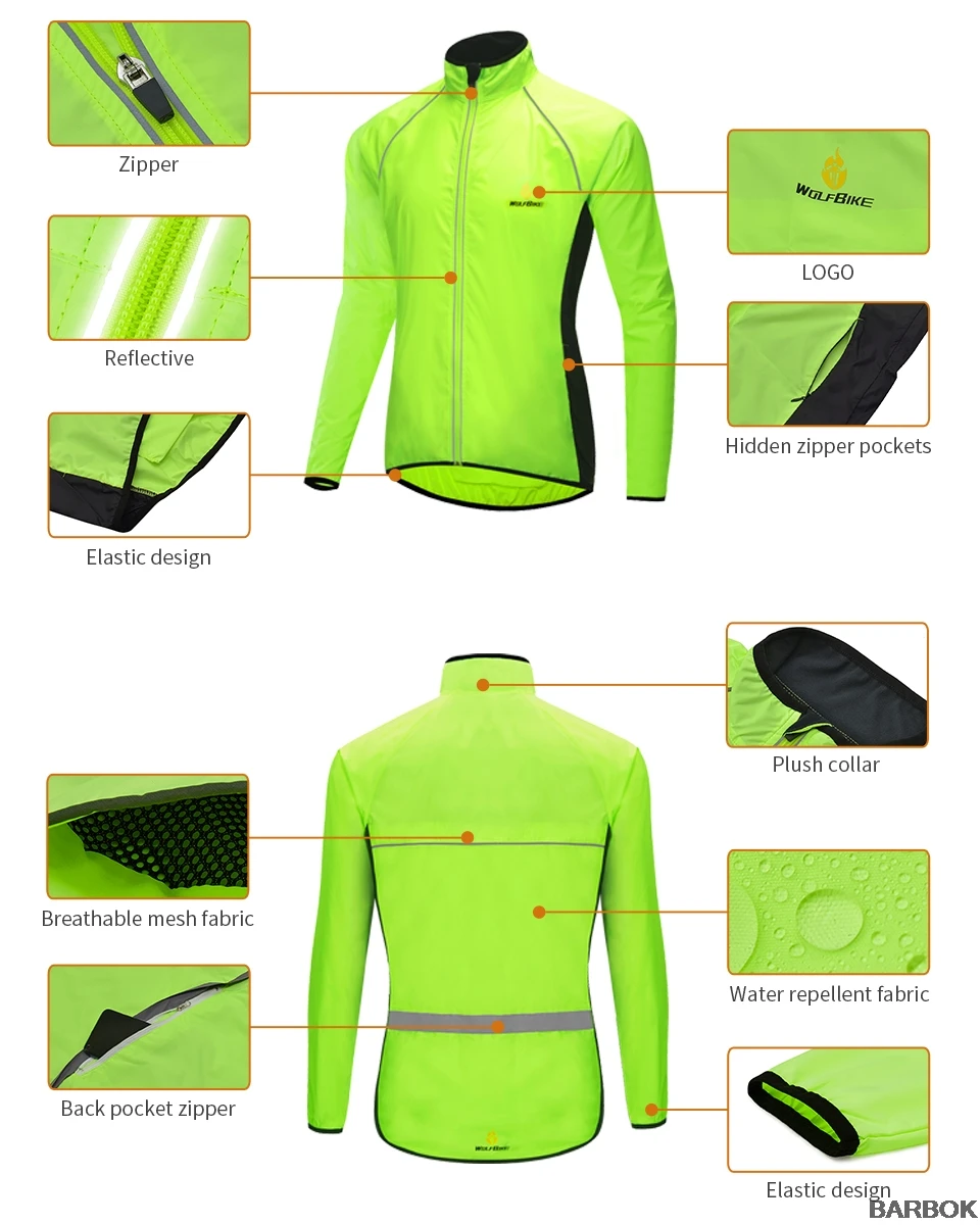 Подходит для долгой и короткой езды, ночной езды, занятий беговыми видами спорта и других видов спорта на открытом воздухеТкань ветрозащитная и водостойкаяЭластичный подол и манжетаНезаметный карман на молнии сбокуВоздухопроницаемый Сетчатый материал на спинеВоротник с окантовкойСветоотражающая протестированная молнияДругие светоотражающие полосы