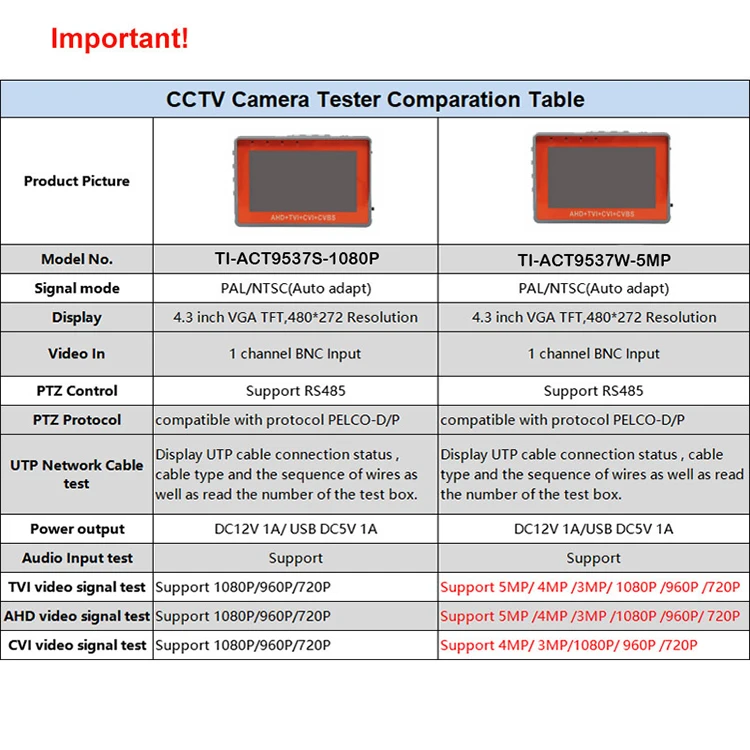 1. 7A-5MP a, поддержка 4,3 дюйма b, разрешение экрана 800*480 c, поддержка 5MP AHD/CVBS видео тест c,PTZ 485 и UTP кабель тестер функция 2.I5V, a,5 дюймов b,HD разрешение экрана 800*480 c, поддержка 8MP AHD + TVI + CVI/CVBS видео тестер d,UTC (HD коаксиальный контроль, BNC коаксиальный Контроль PTZ, но не могу вызвать информацию о меню камеры) и функции RS485 и UTP, поддерживаемые языки включают: английский, итальянский, русский, немецкий, испанский, португальский, английский, китайский