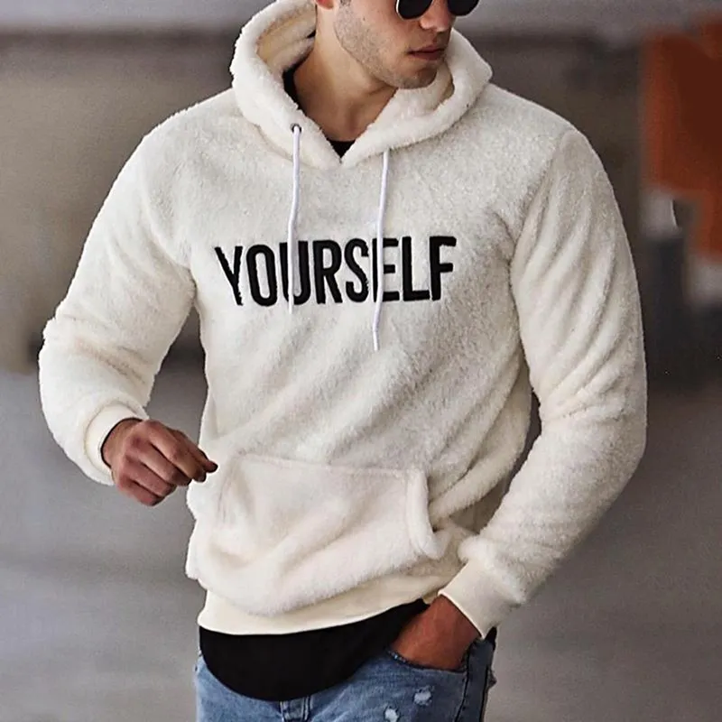 Мужская пушистая флисовая толстовка, пушистый свитшот, повседневный зимний теплый пуловер с капюшоном и надписью и карманами-кенгуру, верхняя одежда, топы