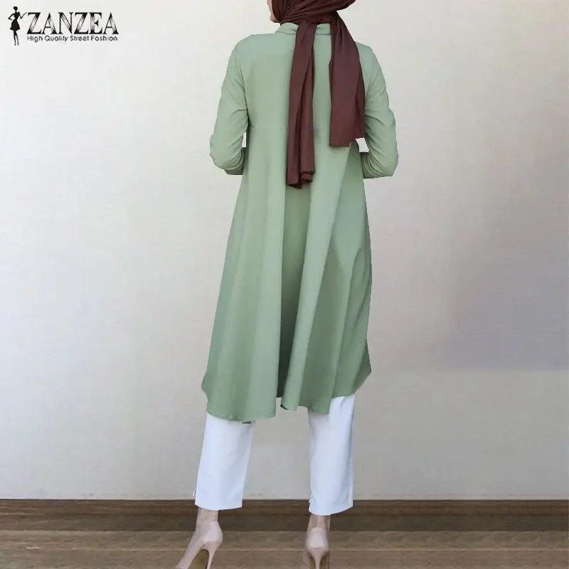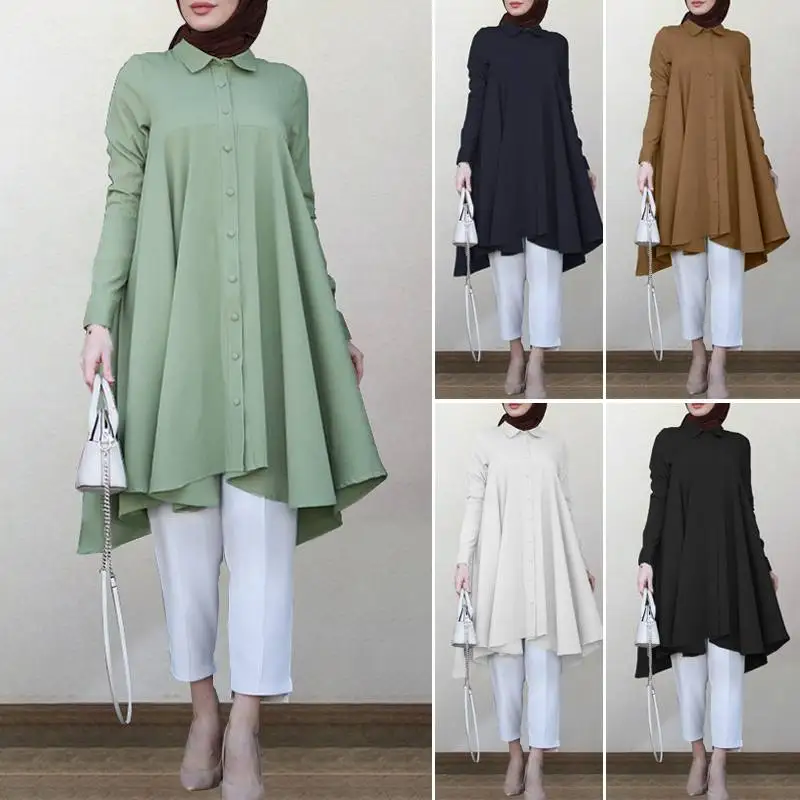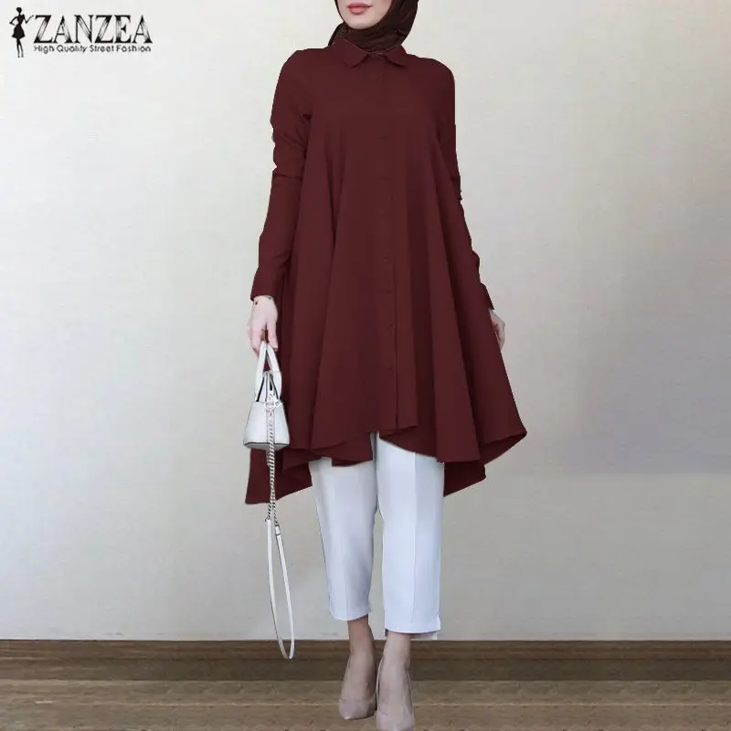 Асимметричные мусульманские рубашки ZANZEA, Женская Осенняя блузка, 2021, повседневные ретро рубашки с длинным рукавом в турецком стиле, однотонная мусульманская одежда