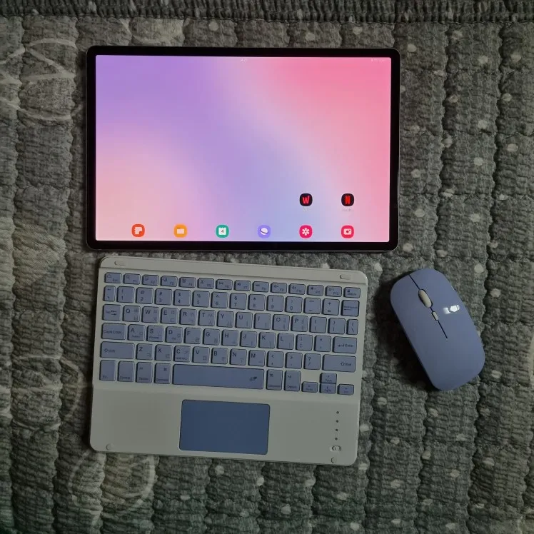 Мышка не очень удобная. Батарейки не нужны, заряжается от провода. Клавиатуру работает только от Bluetooth, а мышка и через Bluetooth и через флешку. Все быстро сконнектилось. И мышка и клавиатуру легкие и компактные, удобно носить с собой