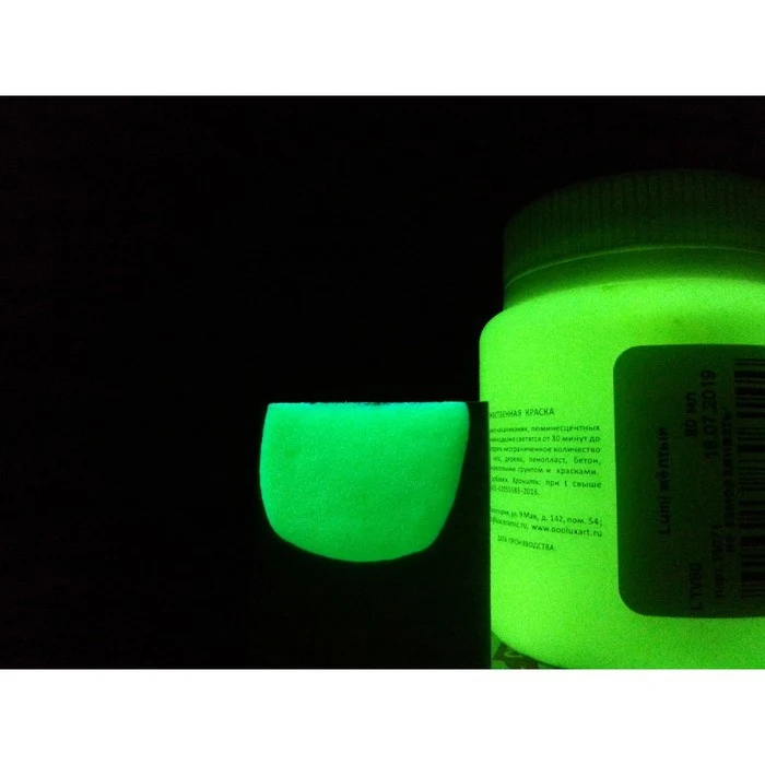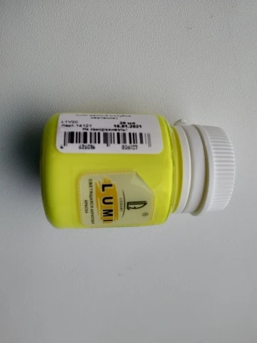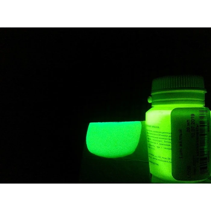 Светится слабо, можно слегка разбавить водой для равномерного слоя. Покрытие легко сковыривается ногтем (с пластика).