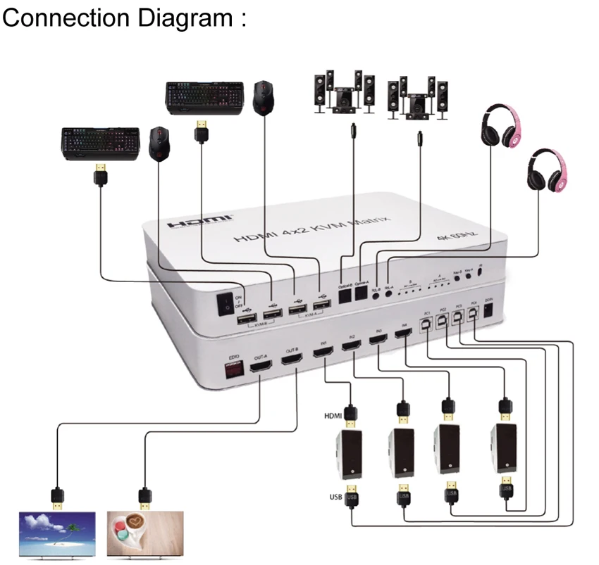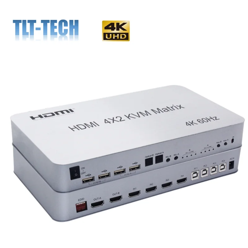 4x2 HDMI KVM матричный переключатель разъемов для аудио и видео сплиттер 4 входа 2 монитора двойной дисплей 4K 60Hz USB 2,0 клавиатура мышь управление 4 компьютера