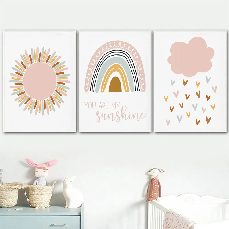 Детский постер с изображением розового солнца, облаков, настенная живопись, Радужный рисунок на холсте в скандинавском стиле для детской комнаты