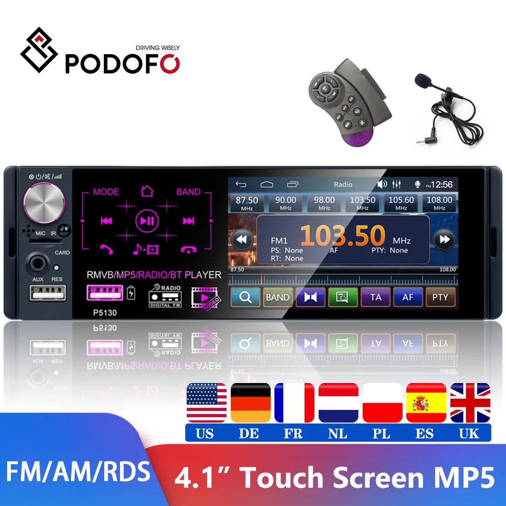 Автомагнитола Podofo 1DIN, Автомобильная магнитола с 4,1 "сенсорным экраном, Bluetooth, RDS USB AUX MP5, видеоплеер, MP3, автомобильная стерео система, универсальная