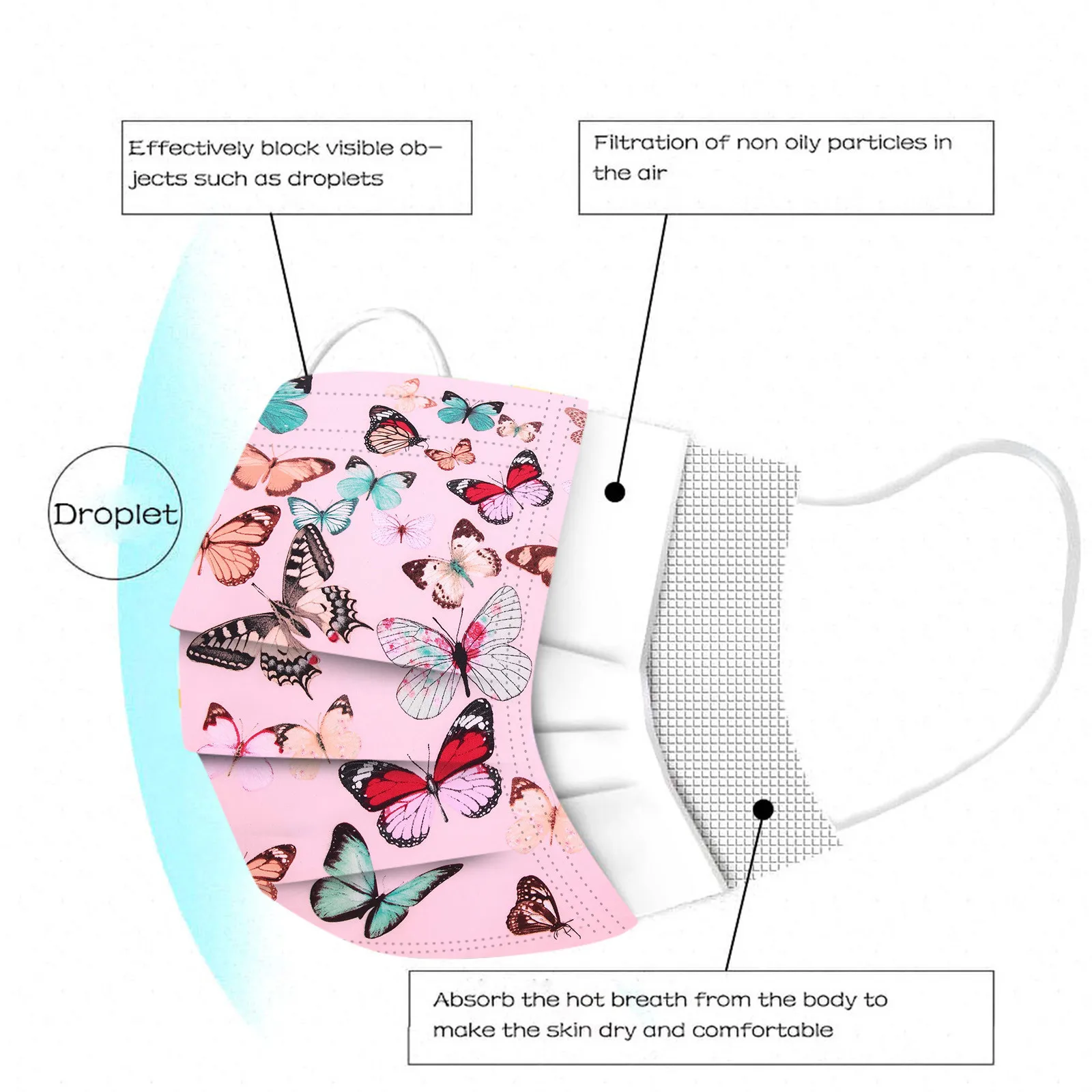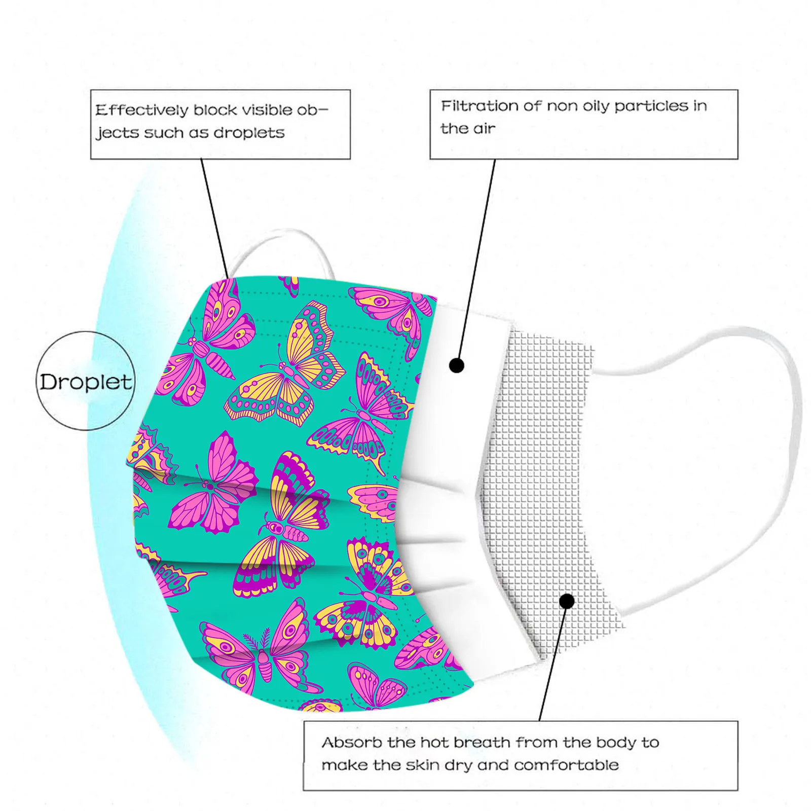В Одноразовая маска изготовлена из 3 слоев нетканого материала, Безопасен и безопасен для использования. Дышащий материал и красивый Узоры, которые делают его полезным и модным. Специальный 3 слоя из нетканого материала Дизайн, обеспечивает некоторую защиту от пыли, автомобильных выхлопных газов, Пыльца и т. д. эластичная Ушная петля, легко носить и не давит на уши.