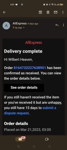 Я купил этот товар в марте 21,2023, и через два дня я получил электронное письмо, и когда я нажал на него, чтобы просмотреть или отследить посылку, он Обновился до «доставленный пакет». Я не получил его, но я подожду еще пару дней, прежде чем подавать официальную жалобу или обрабатывать возврат.