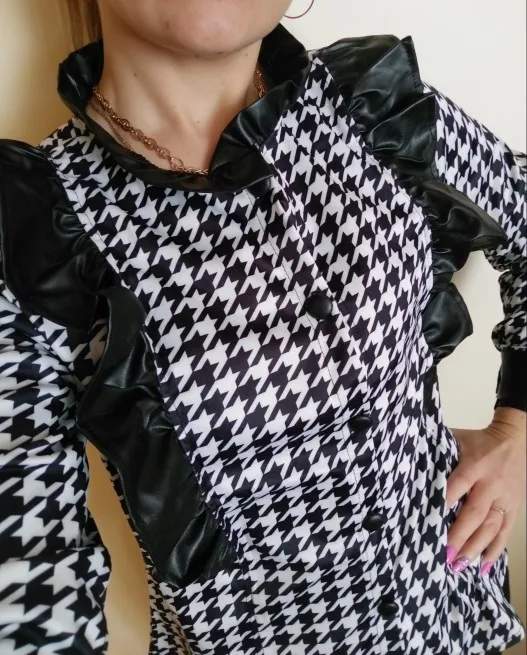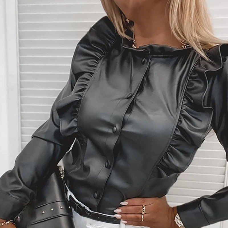 Женская рубашка из искусственной кожи, с принтом гусиные лапки, с длинным рукавом и рюшами