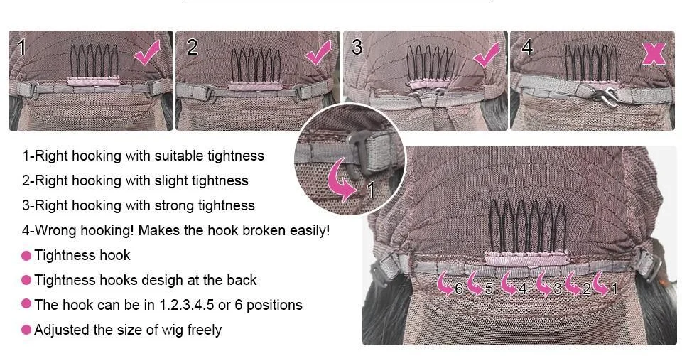 Размер Кружева 4x4, мы используем швейцарское кружево и передовую эластичную сетку, чтобы сделать парик мягким и удобным и эластичным. Парик 22,5 дюйма с двумя регулируемыми лямками, вы можете также использовать плечевой ремень, чтобы настроить ваш парик. Он имеет три расчески для более точного определения парик.