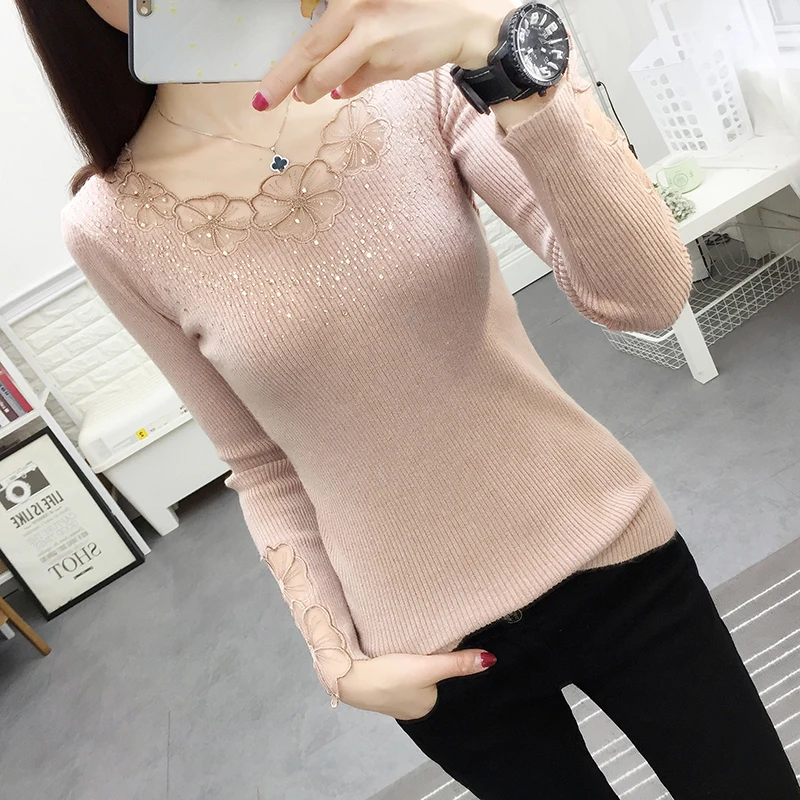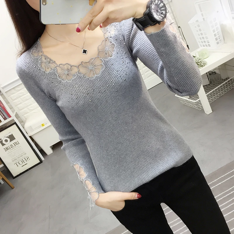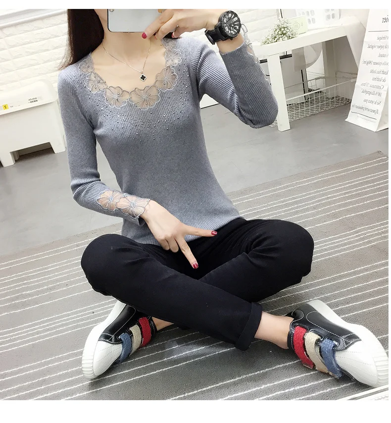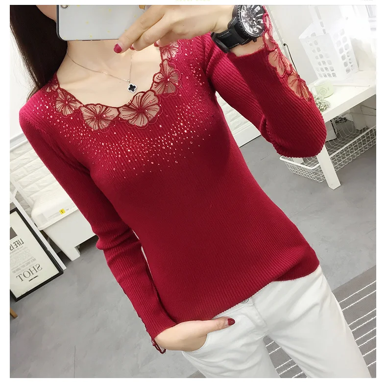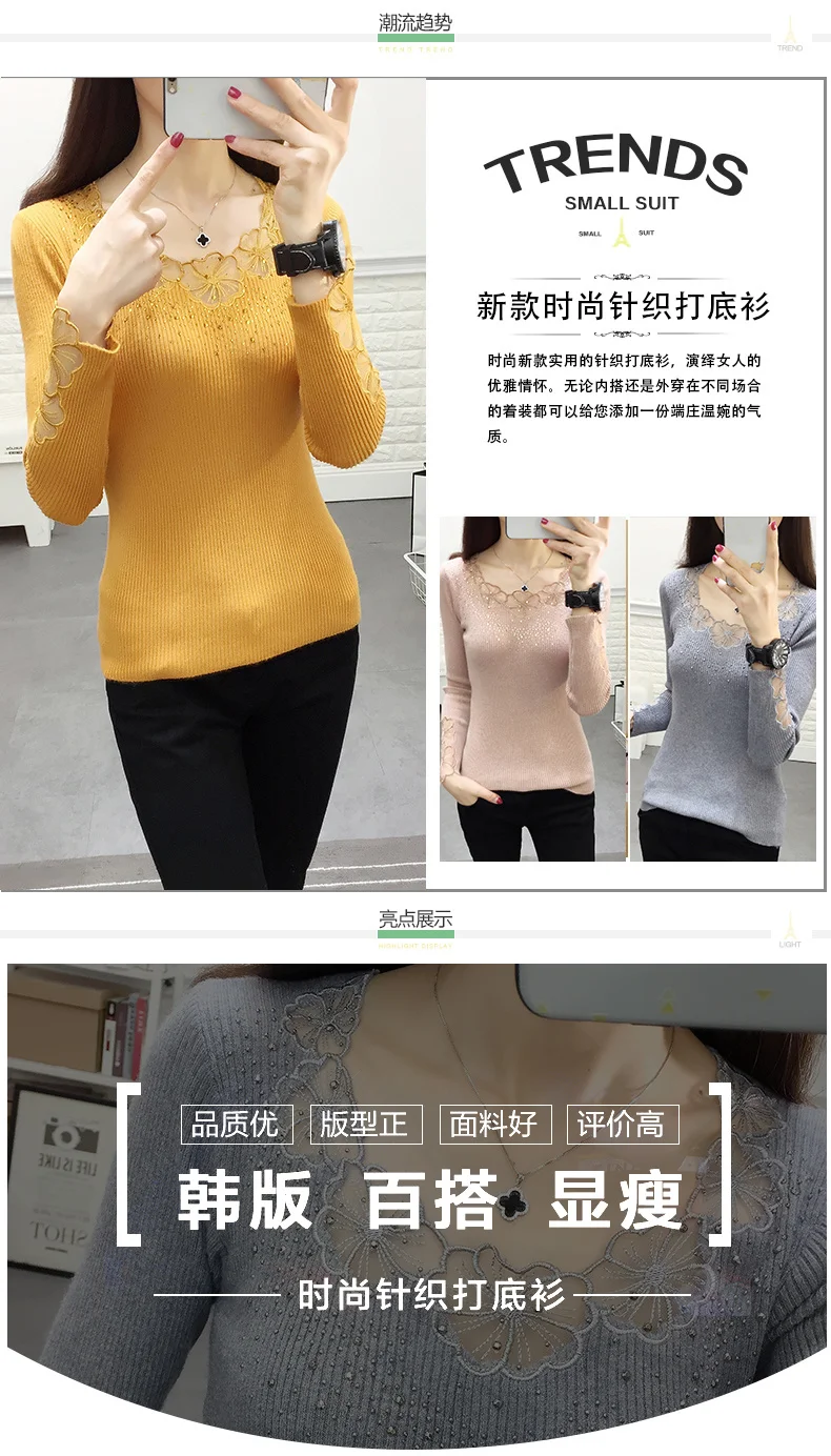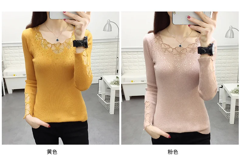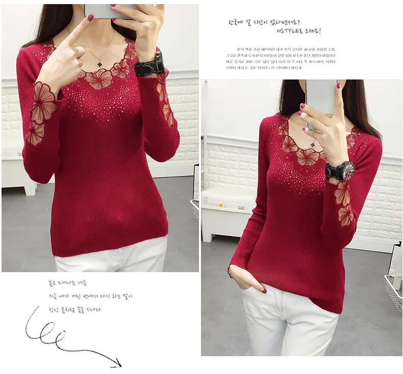 Новый пуловер, свитер, женская Свободная рубашка с длинным рукавом, вышивкой и круглым вырезом, трикотажная кружевная ажурная сексуальная Нижняя рубашка, трикотажная одежда