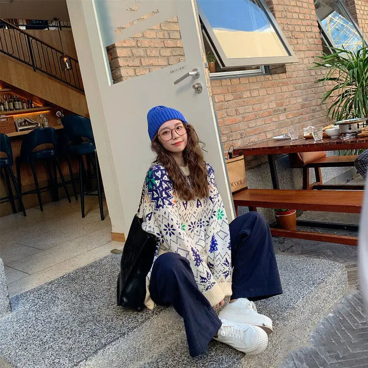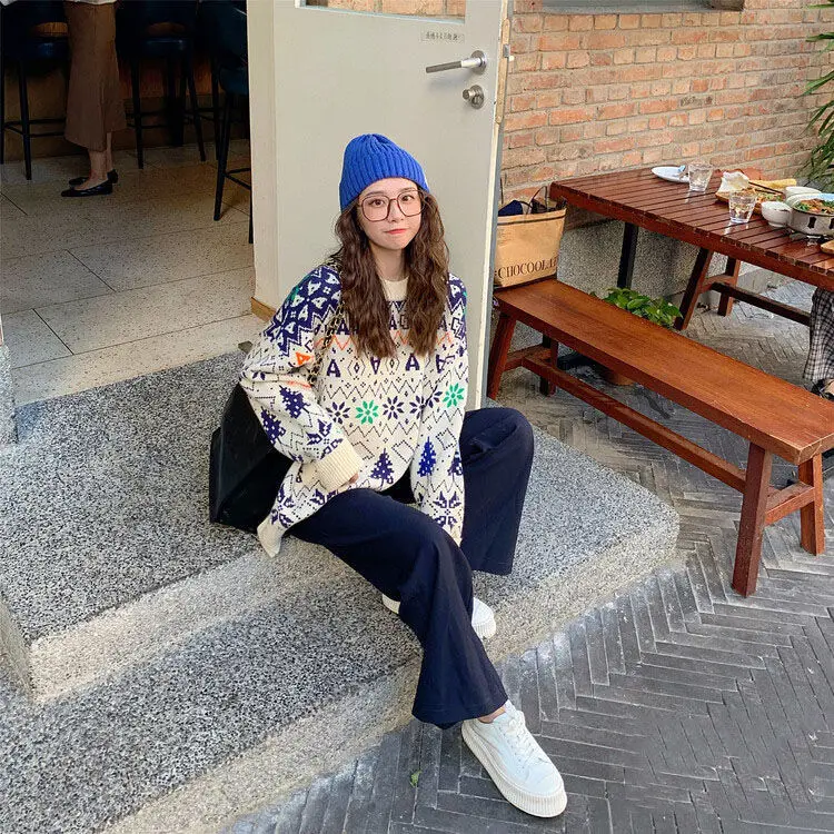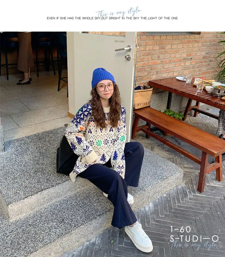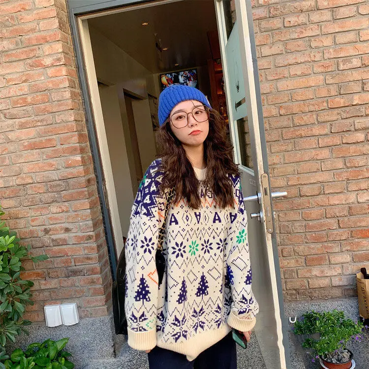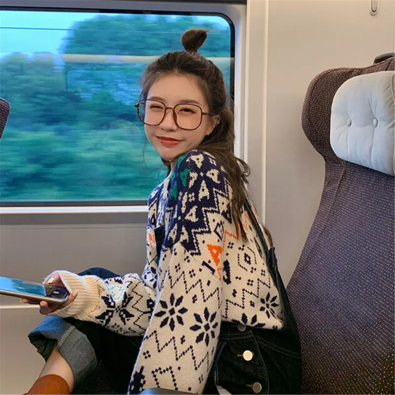 Женский винтажный свитер, свободный жаккардовый пуловер с круглым вырезом, топ на осень-зиму 2020