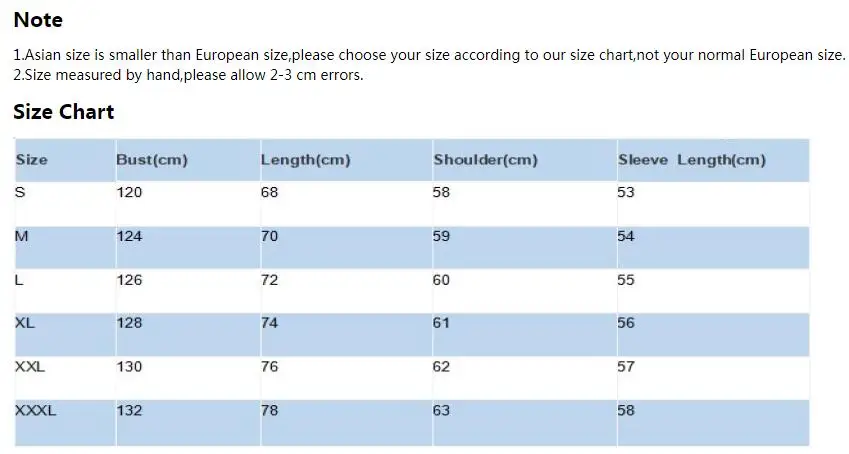 1. Азиатские размеры меньше европейских, пожалуйста, выберите свой размер в соответствии с нашей таблицей размеров, а не вашим обычным Европейским размером.2. Размер измеряется вручную, допускается погрешность в 2-3 см.
