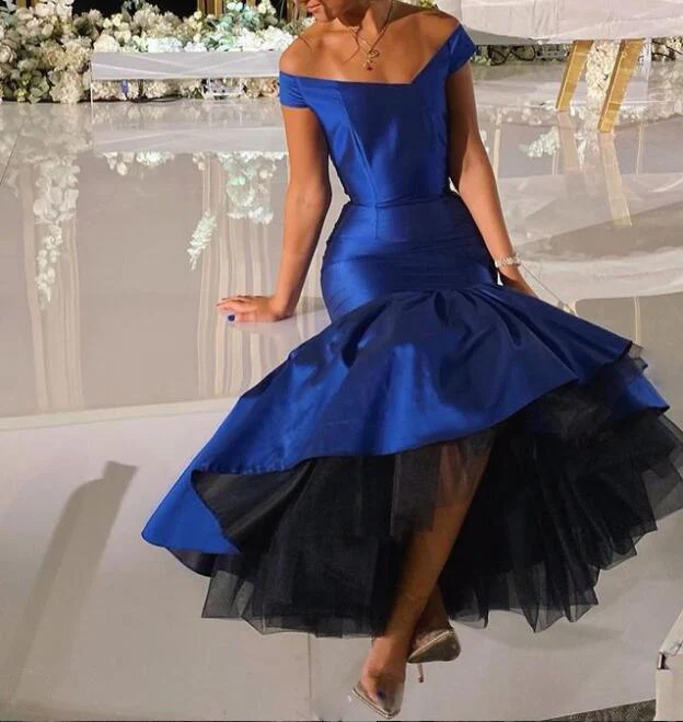 Женское вечернее платье с юбкой-годе, темно-синее фатиновое платье с открытыми плечами и пуговицами, длиной ниже колена, официальное платье для вечеринки