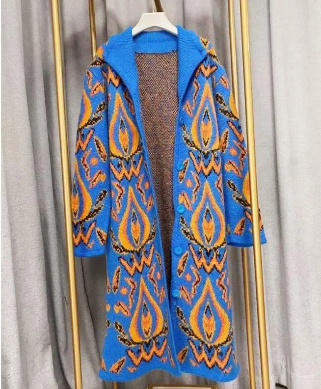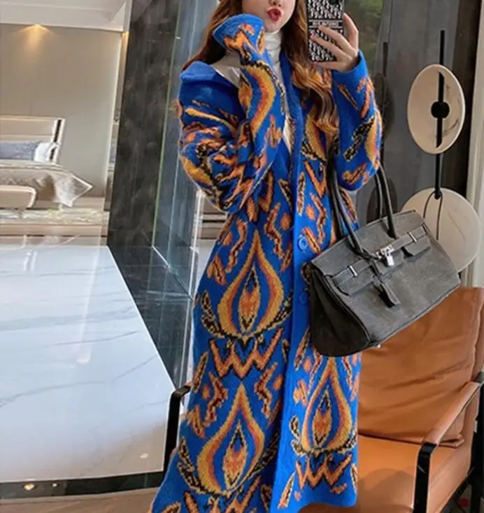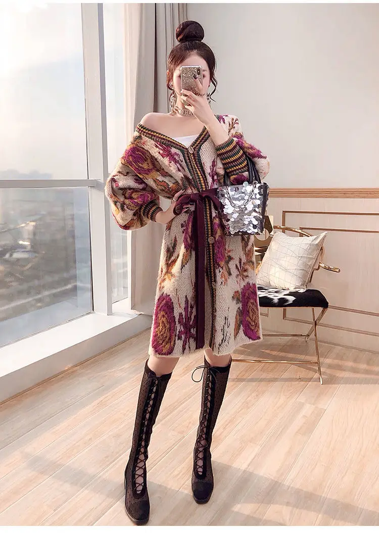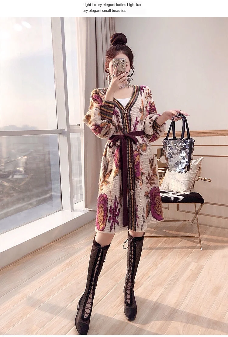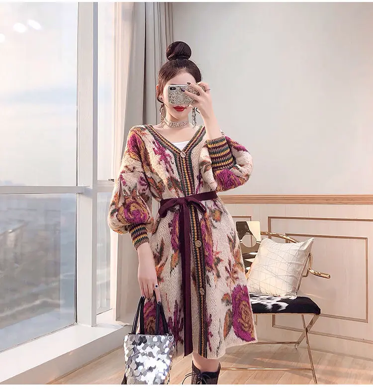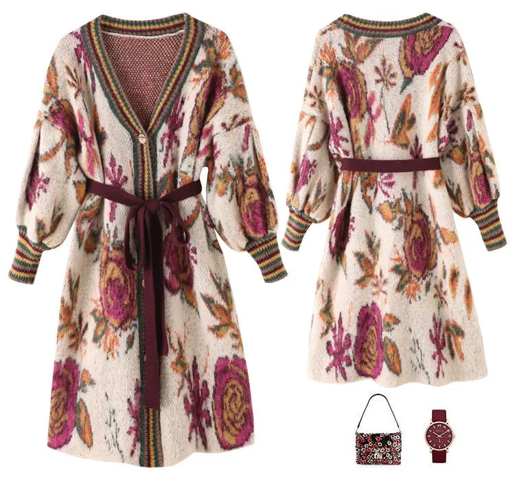 Осень-зима, повседневные длинные кардиганы, женские винтажные узоры, вязаный свитер с поясом и длинным рукавом, кардиганы, шерстяная верхняя одежда