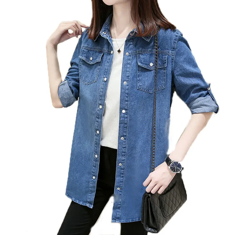 Женская джинсовая рубашка свободного покроя, с длинным рукавом