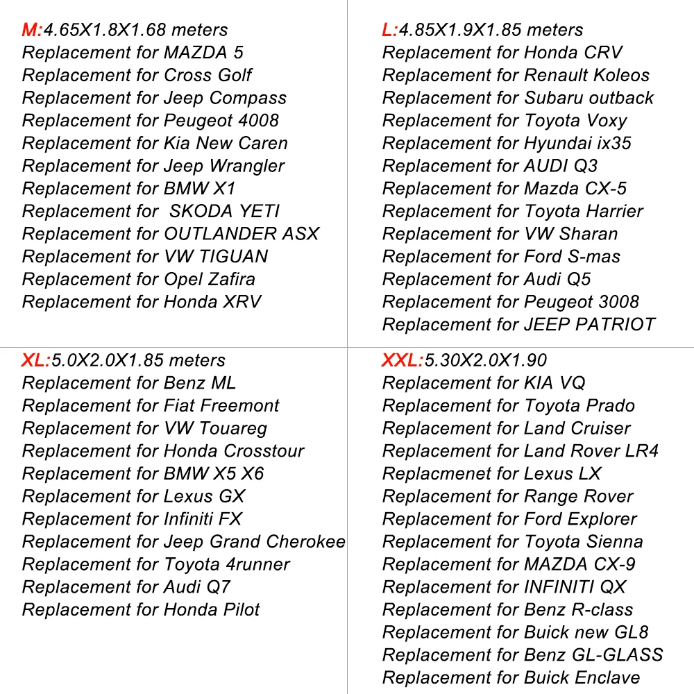 Особенности:Крышка автомобиля может эффективно предотвратить вредные УФ-лучи, грязь, пыль, снег, мороз и т. Д.Изготовлен из водонепроницаемого материалаТкань для зонта, Дольше срока службы, чем другие материалы в ту же погоду.Поставляется с 6 флуоресцентными светоотражающими полосками, которые защищают вашу безопасность автомобиля ночью.Он эффективно предотвращает пыль, сохраняя автомобиль внутри и снаружи чистым и аккуратным.Есть 4 различных размера крышки автомобиля вы можете выбрать из, чтобы удовлетворить различные потребности.M:4.65X1.8X1.68 метровЗамена для MAZDA 5Замена для Cross GolfЗамена для джипа компасаЗамена для Peugeot 4008Замена для Kia New CarenЗамена для Jeep WranglerЗамена для BMW X1Замена для SKODA YE-TIЗамена для OUTLANDER ASXЗамена для VW TIGUANЗамена для Opel ZafiraЗамена для Honda XRVL:4.85X1.9X1.85 метровЗамена для Honda CRVЗамена для Renault KoleosЗамена для Subaru outbackЗамена для Toyota VoxyЗамена для Hyundai ix35Замена для AUDI Q3Замена для Mazda CX-5Замена для Toyota HarrierЗамена для VW SharanЗамена для Ford S-masЗамена для Audi Q5Замена для Peugeot 3008Замена для JEEP PATRIOTXL:5.0X2.0X1.85 метровЗамена для Benz MLЗамена для Fiat FreemontЗамена для VW T-ouaregЗамена для Honda CrosstourЗамена для BMW X5 X6Замена для Lexus GXЗамена для Infiniti FXЗамена для Jeep Grand CherokeeЗамена для Toyota 4runnerЗамена для Audi Q7Замена для Honda PilotXXL:5.30X2.0X1.90Замена для KIA VQЗамена для Toyota PradoЗамена для Land CruiserЗамена для Land Rover LR4Замена для Lexus LXЗамена для Range RoverЗамена для Ford ExplorerЗамена для Toyota SiennaЗамена для MAZDA CX-9Замена для INFINITI QXЗамена для Benz R-classЗамена для Buick new GL8Замена для Benz GL-GLASSЗамена для Buick EnclaveХарактеристики:Тип изделия: чехол для автомобиляТип материала:Ткань для зонтаЦвет: черныйСовместимый тип автомобиля: Для СеданаРазмер: S, M, L, XL, XXL (опционально)Специальные Особенности: солнцезащитный, пыленепроницаемый и водонепроницаемый, анти-УФ, ТермоЗащита, устойчивость к царапинамРазмер посылка: 43*33*5 смВес посылка: 955 г/30,15 унцийПосылка:1 * чехол1 * сумка для хранения