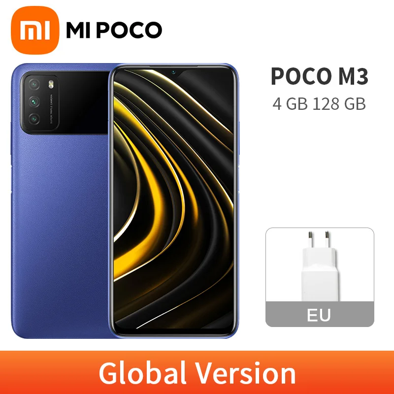 Глобальная версия POCO M3 M 3, 4 Гб, 128 ГБ, тройная камера 48 МП, Аккумулятор 6000 мАч, Snapdragon 662, мобильный телефон, 6,53 дюйма, точечный дисплей