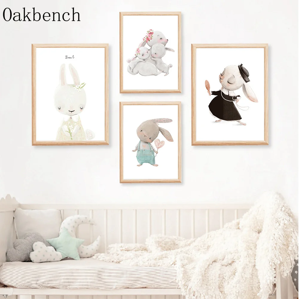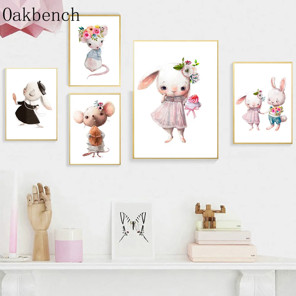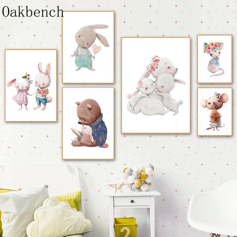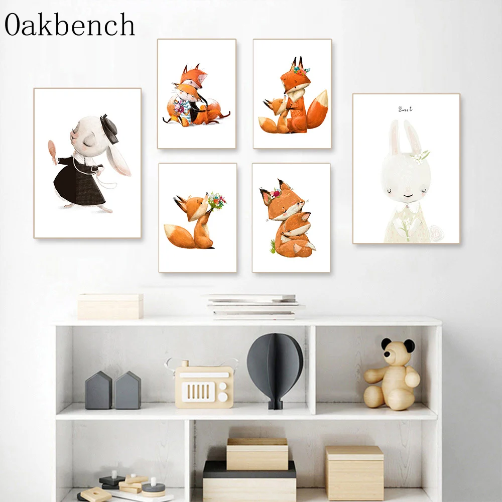 Настенный постер с изображением кролика, медведя, мыши, живопись на холсте, мультфильмы, лисы, кролика, детской комнаты