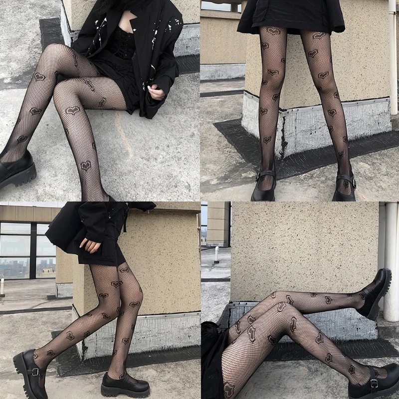Готический стиль, высокая талия, эластичный пояс, сексуальные ажурные колготки, прозрачные, сердечко жаккардовое.
