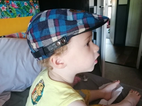 Подходит для детей от шести месяцев до 5 лет. Центральная задняя часть крышки имеет резиновый ремешок для регулировки размера с + 2 см на основе размера этикетки.