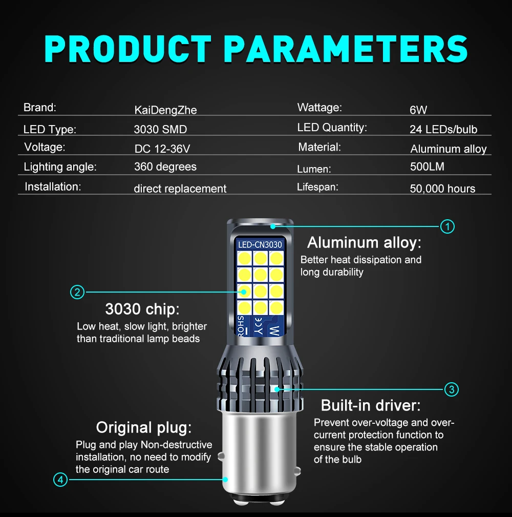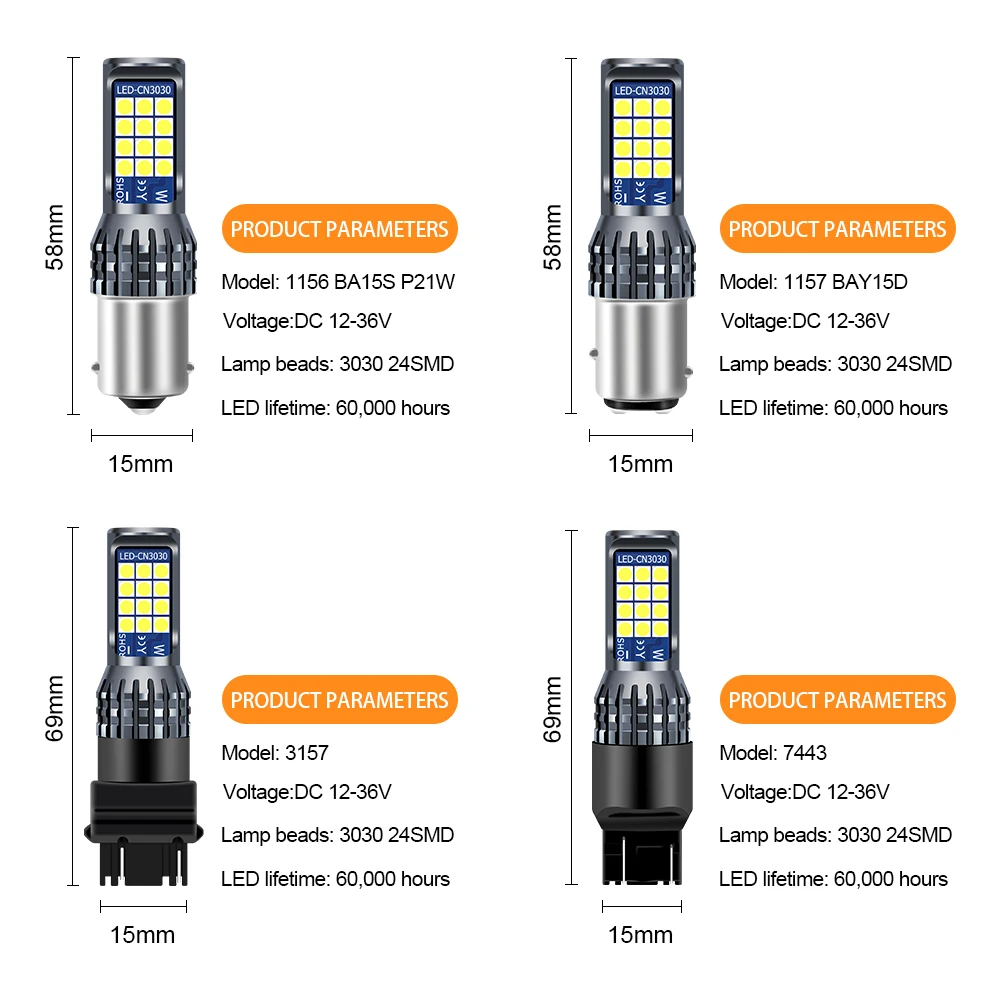 【????Описание????】????【 1156 1157 3157 7443 】Each лампа мощностью 24 шт. 3030SMD светодиодный чипов. Номинальная мощность составляет около 6W.500 люмен Выход. Высокое качество и чрезвычайно яркий светодиодный ламп. Сделает вас более безопасным во время вождения.????【Ультра яркий и более длительный срок службы 】 использование высококачественных 3030 чипов, супер изюминка, более длинное расстояние освещения, до 30 метров. В алюминиевый сплав оболочки с эффективного рассеивания тепла и Новинка Сетчатый Дизайн продлить срок службы лампы, до 60000 часов.????【Простая установка 】 быстрая и простая установка, замена оригинального положения. Очень быстрое время отклика. Конструкция без полярности, простая установка подключи и работай.????【Купить с уверенностью 】мы предлагаем хорошее предпродажное и послепродажное обслуживание для вас. Если у вас есть какие-либо проблемы с этим продуктом, пожалуйста, не стесняйтесь связаться с нами.【????Технические характеристики????】????Тип разъема: 1156 BA15s,1157 BAY15D,3157 T25,7443 T20????Светодиодный чип: 3030 24SMD????Цвет освещения: белый, красный, желтый, белый и желтый????Напряжение: 12 - 36 в????Мощность: 6 Вт????Люмен: 500 лм????Срок службы: около 60000 часов????Материал: Алюминиевый металлический корпус, светодиодный чип????Стандарты и сертификаты: CE/ROHS【????Применение????】????Задний светильник, тормозной светильник, дневной ходовой светильник, задний светильник【????Продукт включает в себя????】????2 шт 3030 24SMD лампы【????Советы????】????Если вы не уверены, какую розетку следует приобрести, пожалуйста, не стесняйтесь подтвердить с нами.????Некоторые модели автомобилей могут потребоваться установить декодер, чтобы предотвратить Мерцание Лампы.????Надеюсь, у вас есть хороший опыт покупок!