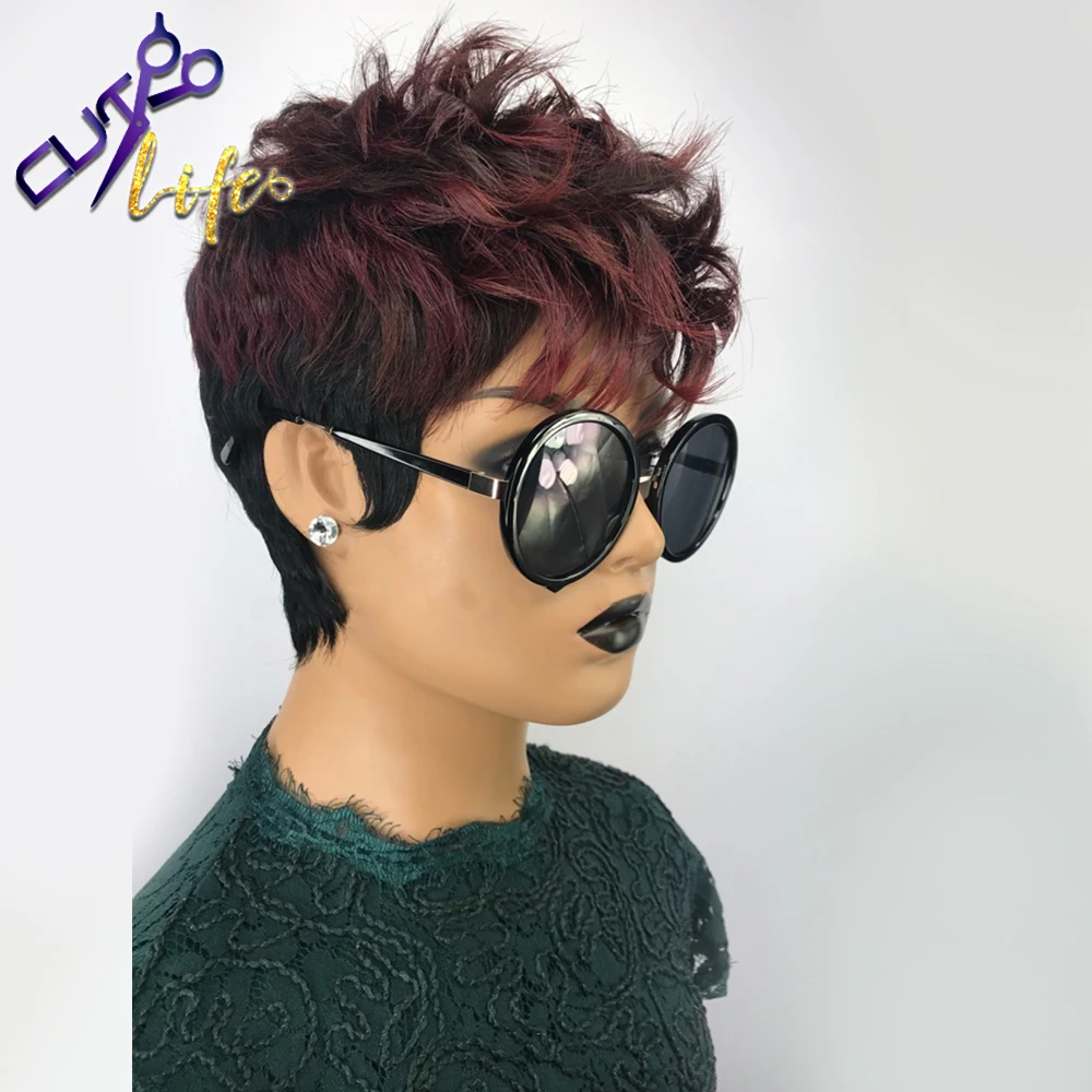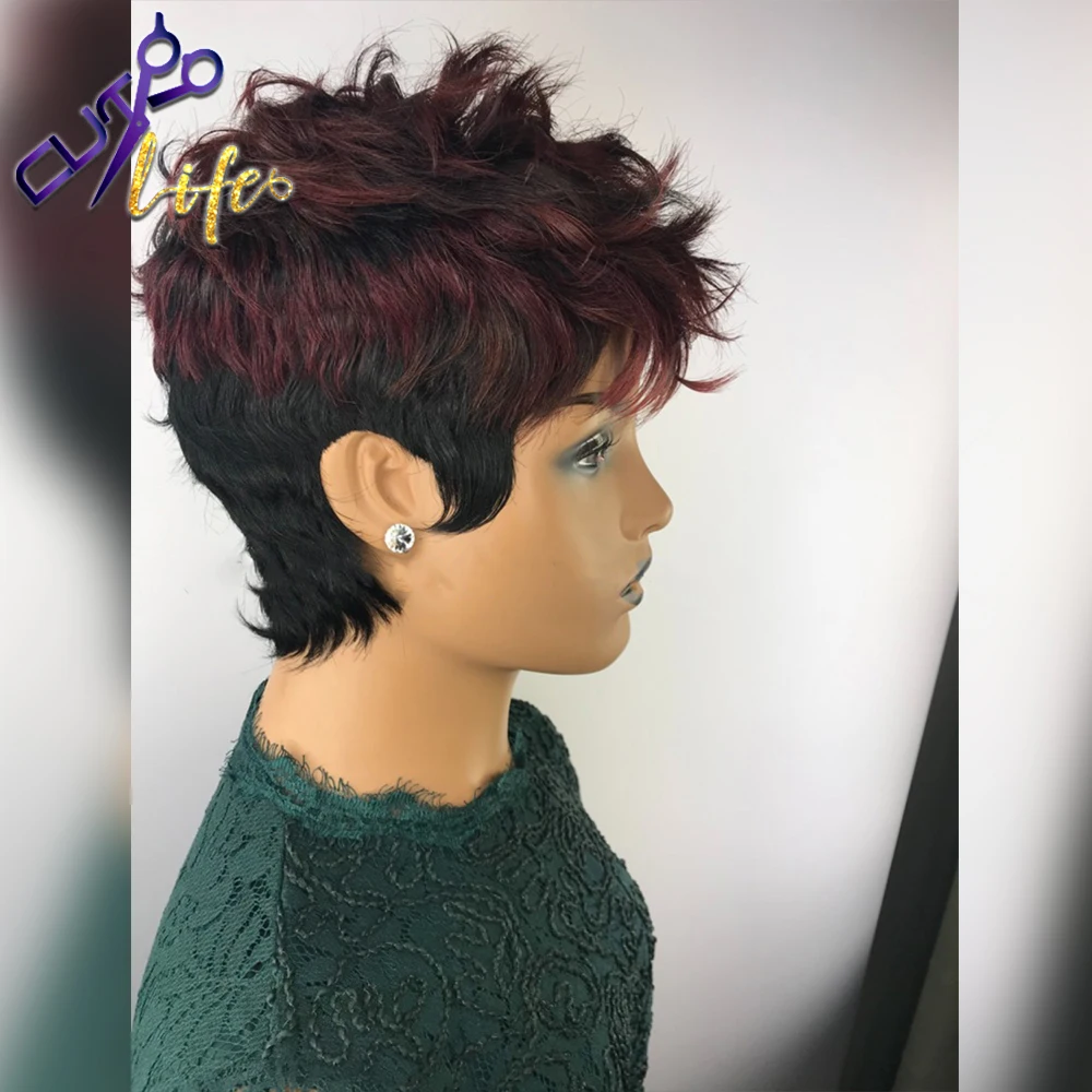 Парик перуанский из натуральных волос с челкой для чернокожих женщин, бордовый 99J, короткие волнистые волосы Омбре, стрижка Боба Пикси, полностью автоматический, без парика на шнурке