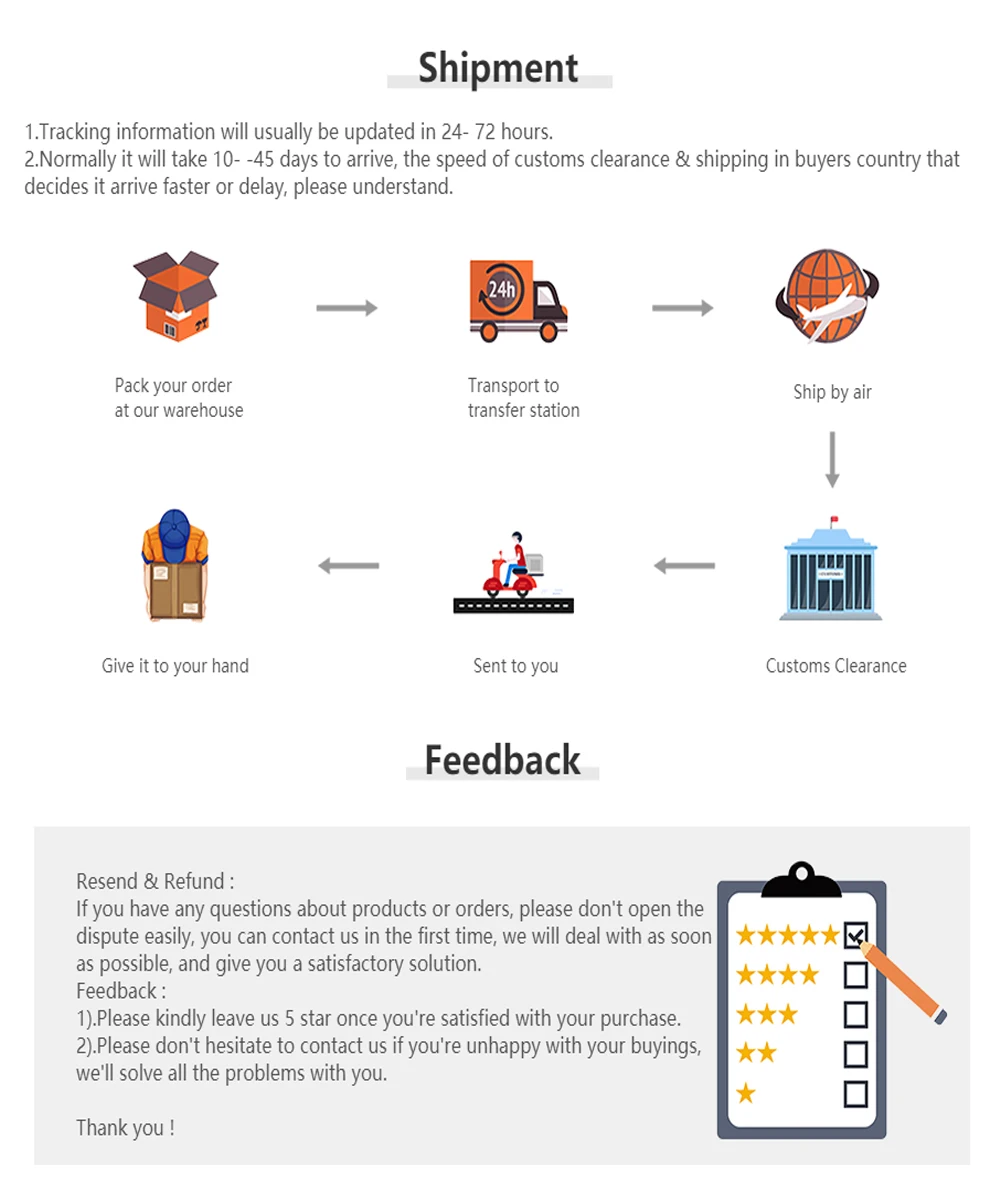 1) ваши отзывы очень важны для нас. Пожалуйста, нажмите 5 звезд отзывы, если вам нравятся наши товары и услуги. Я предоставлю конкурентоспособную цену и лучшее обслуживание на всем пути.
