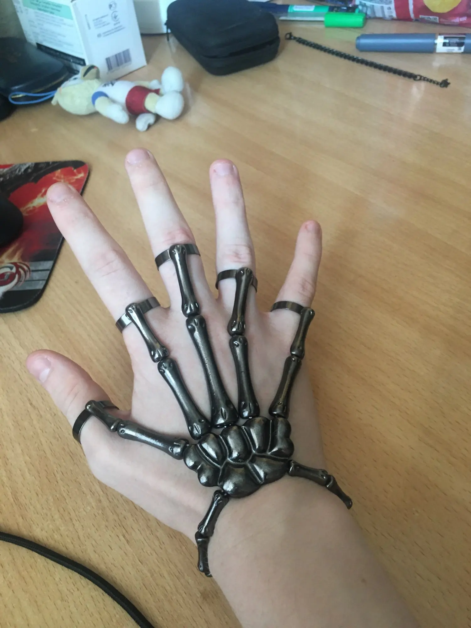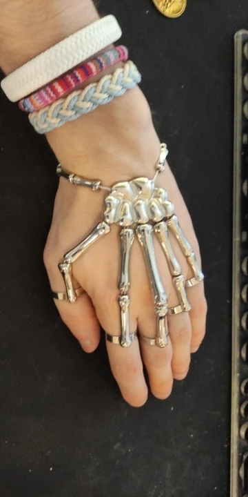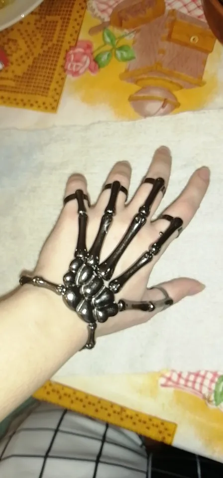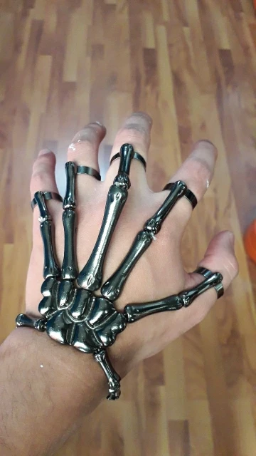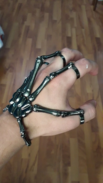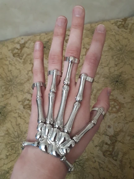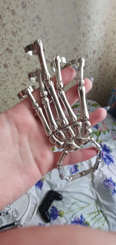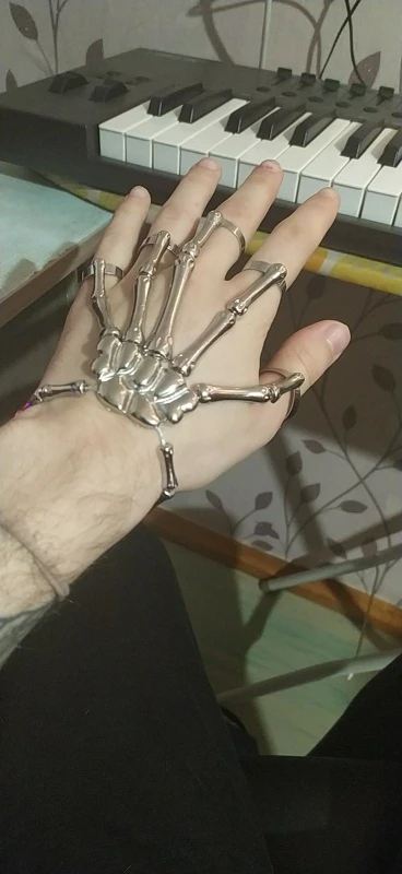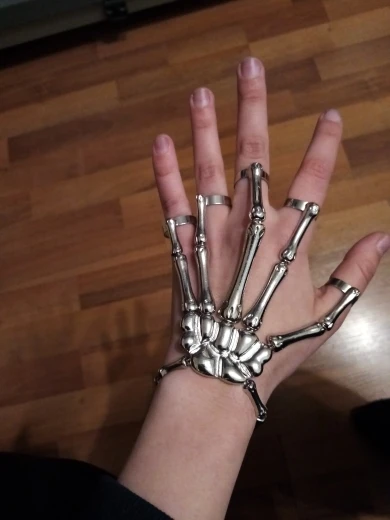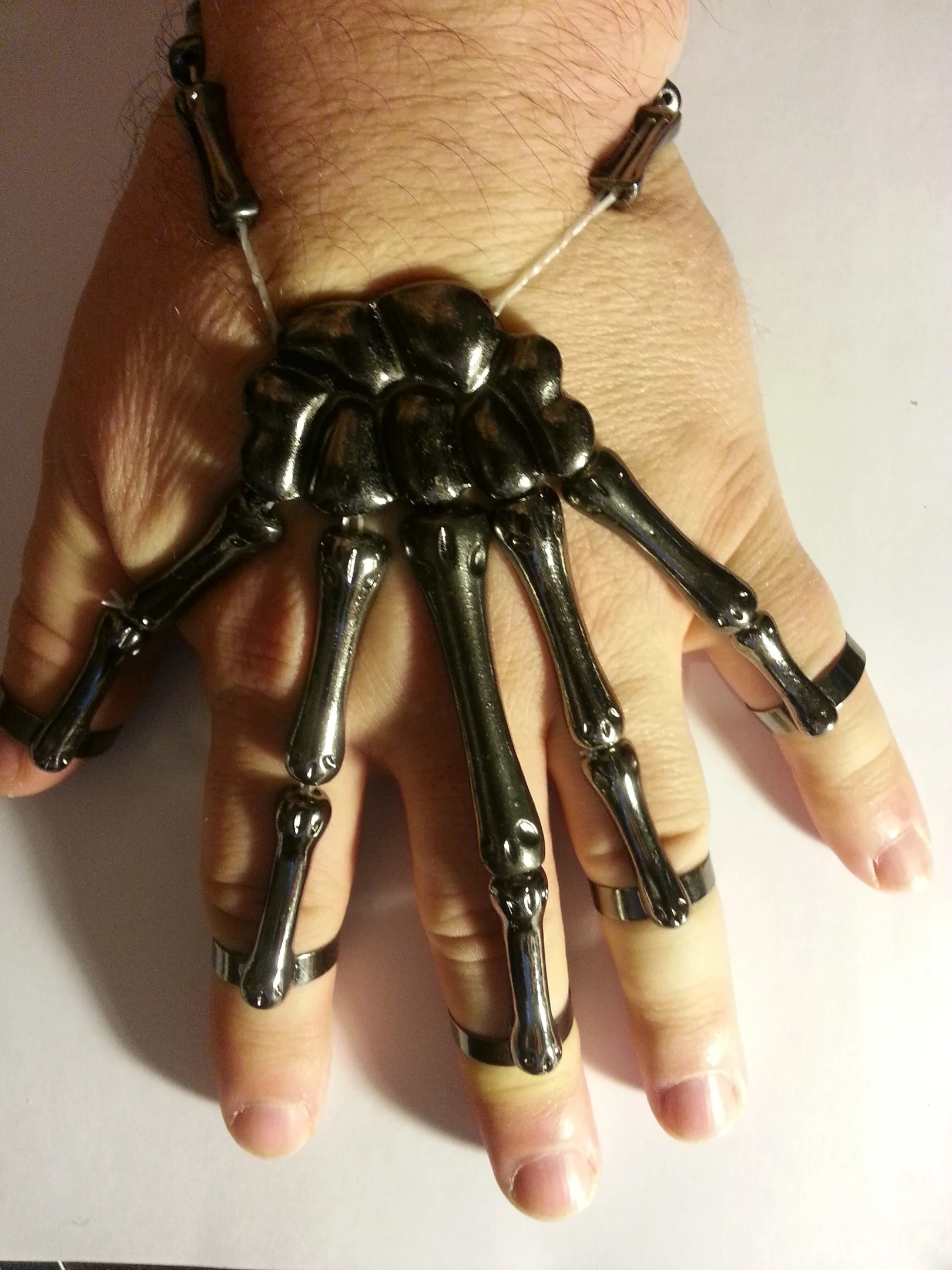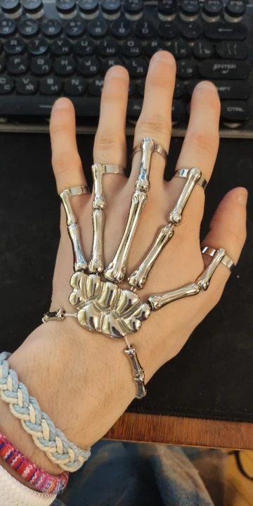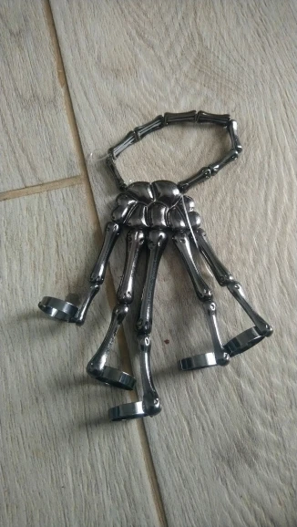 Доча счастлива! Страдает что в школу нельзя такие украшения одевать))) Весь скелет собран на резиночки, одевается несложно. Маловат для ладошки взрослого человека.