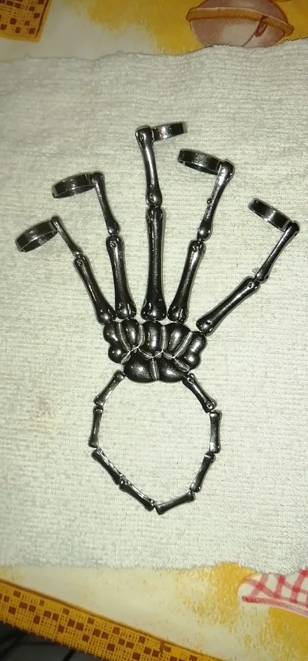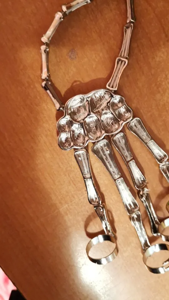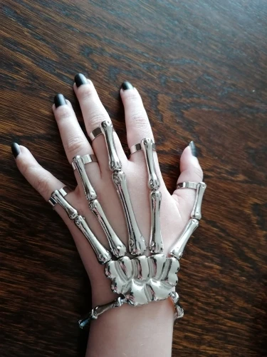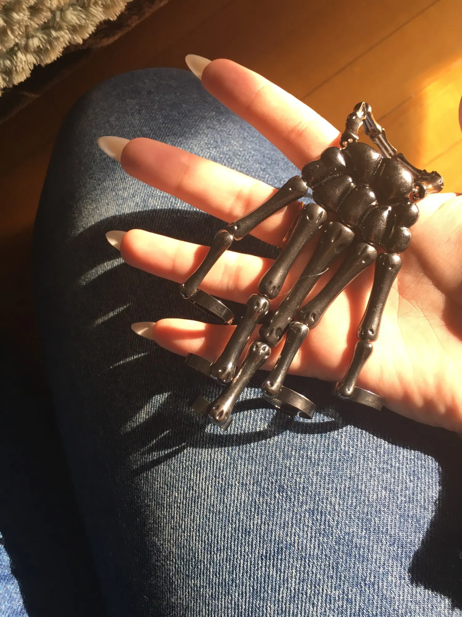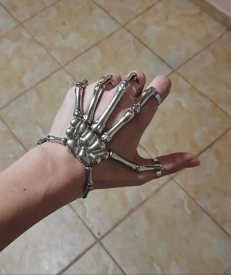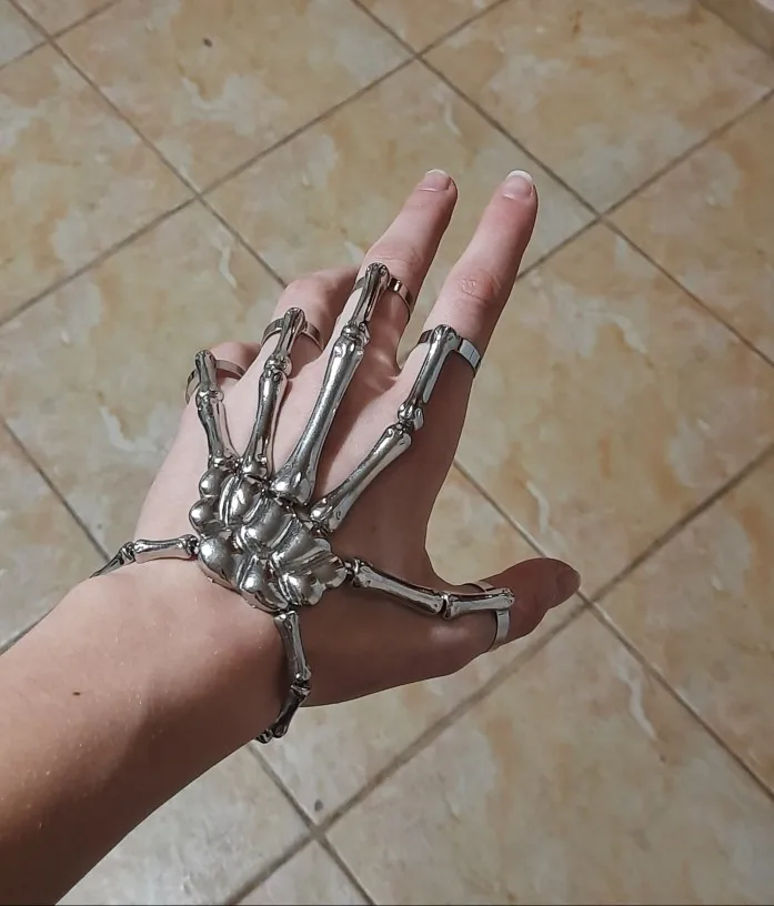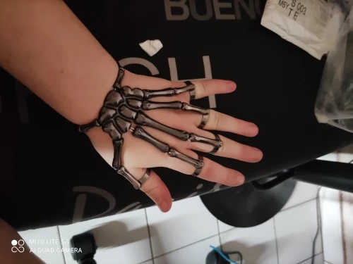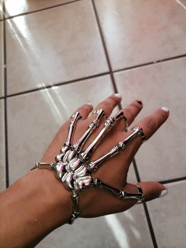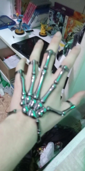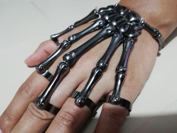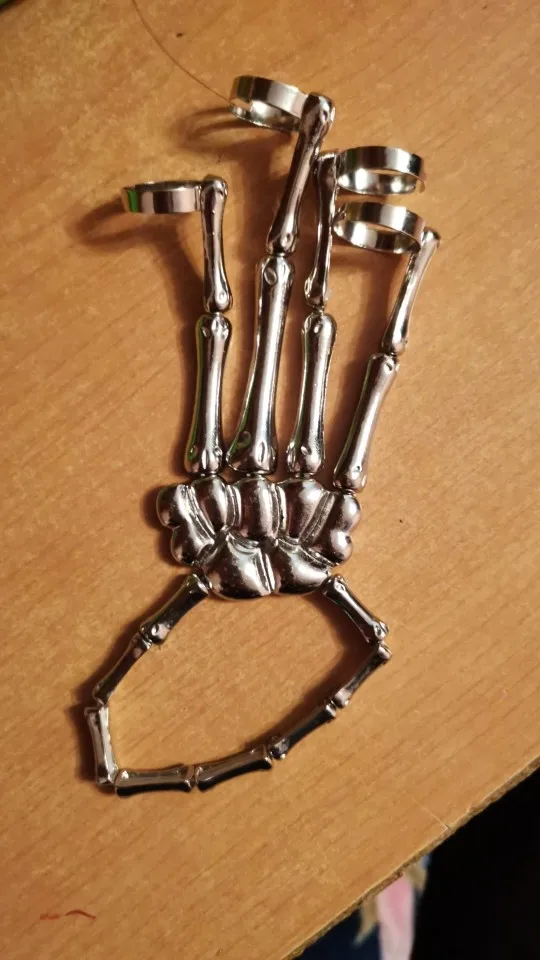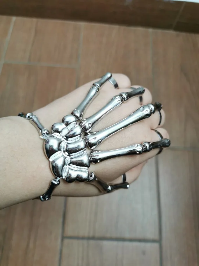 Доча счастлива! Страдает что в школу нельзя такие украшения одевать))) Весь скелет собран на резиночки, одевается несложно. Маловат для ладошки взрослого человека.
